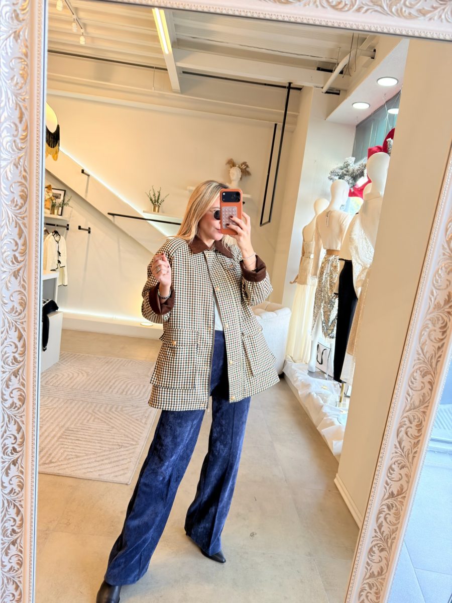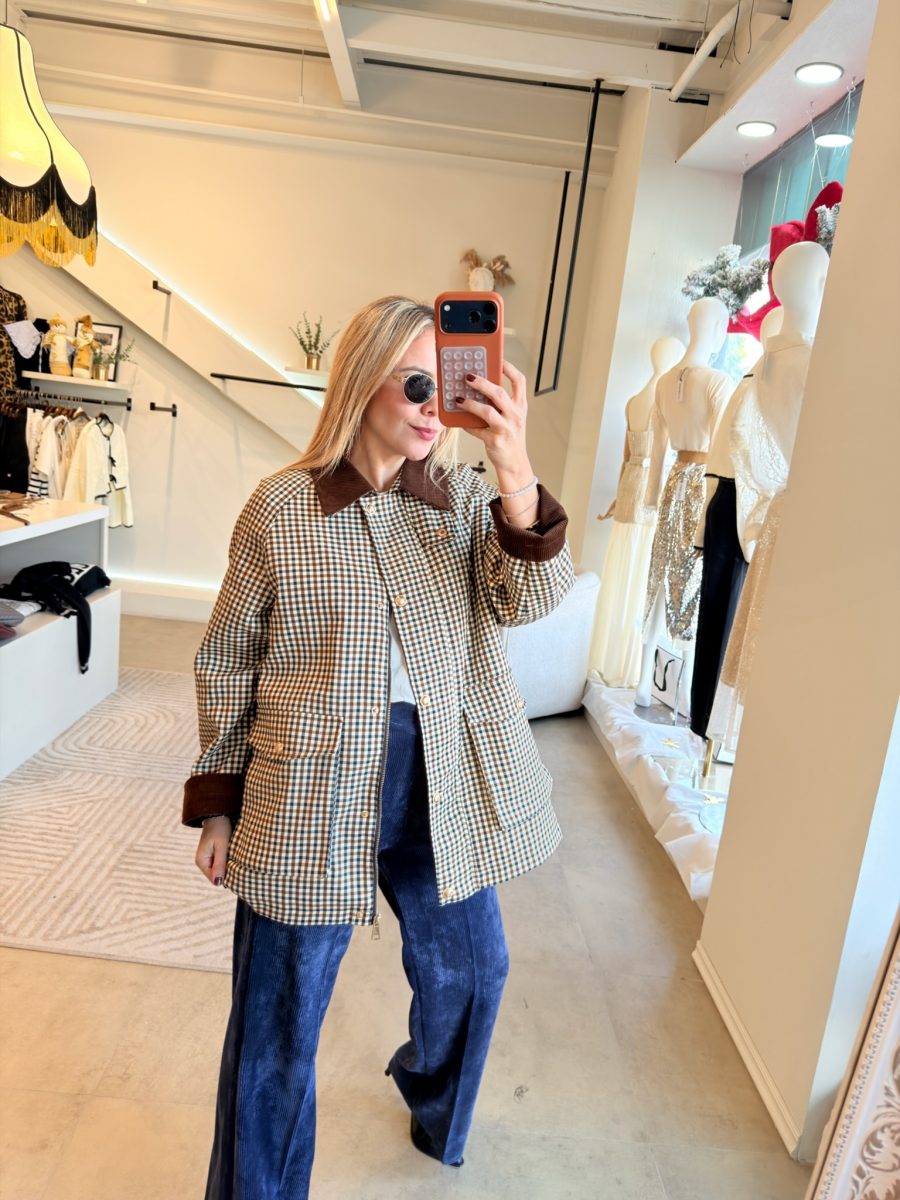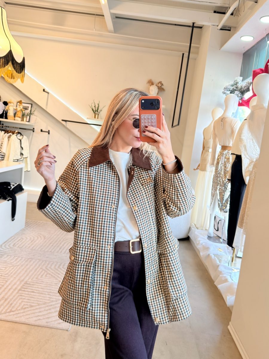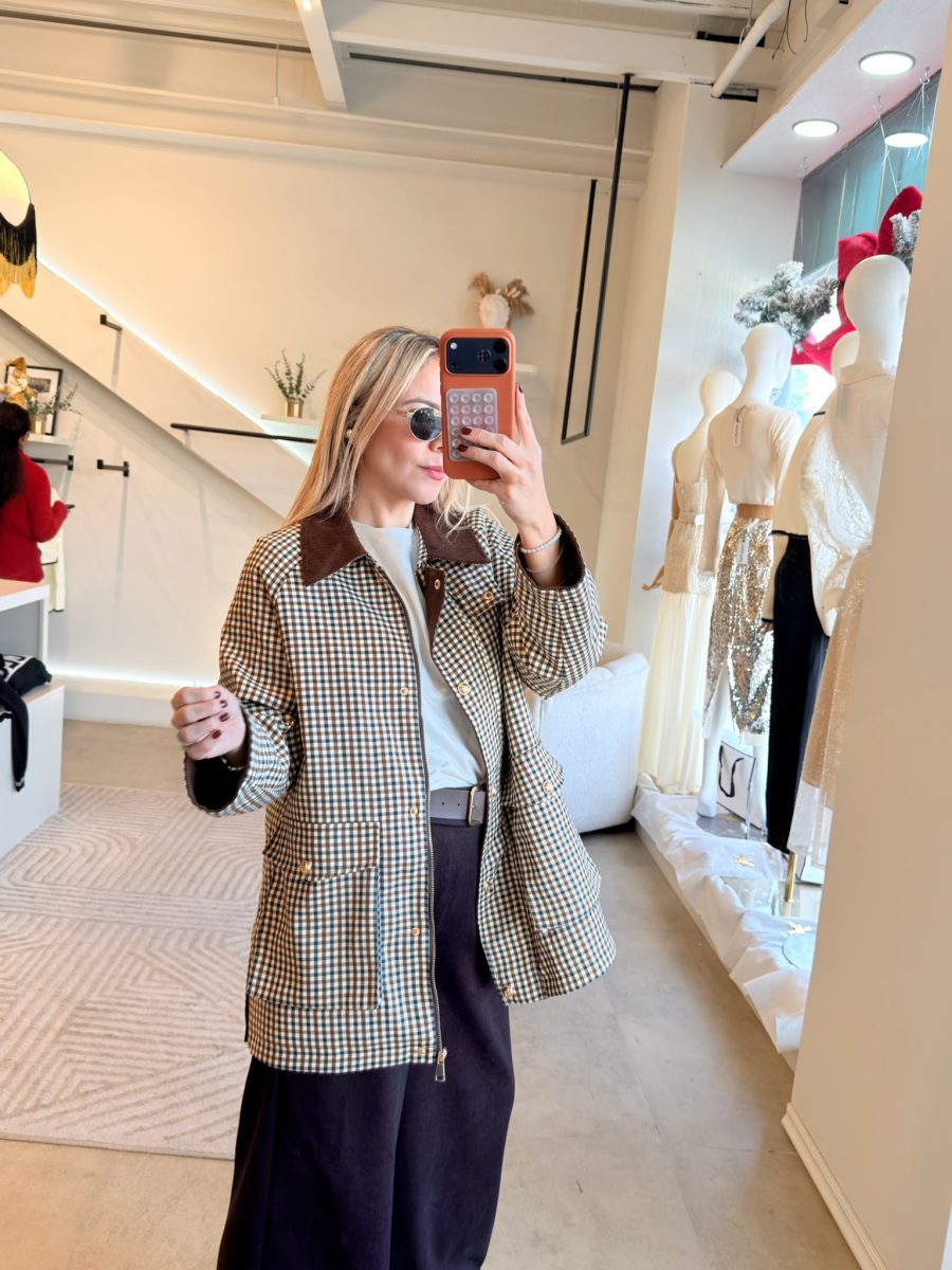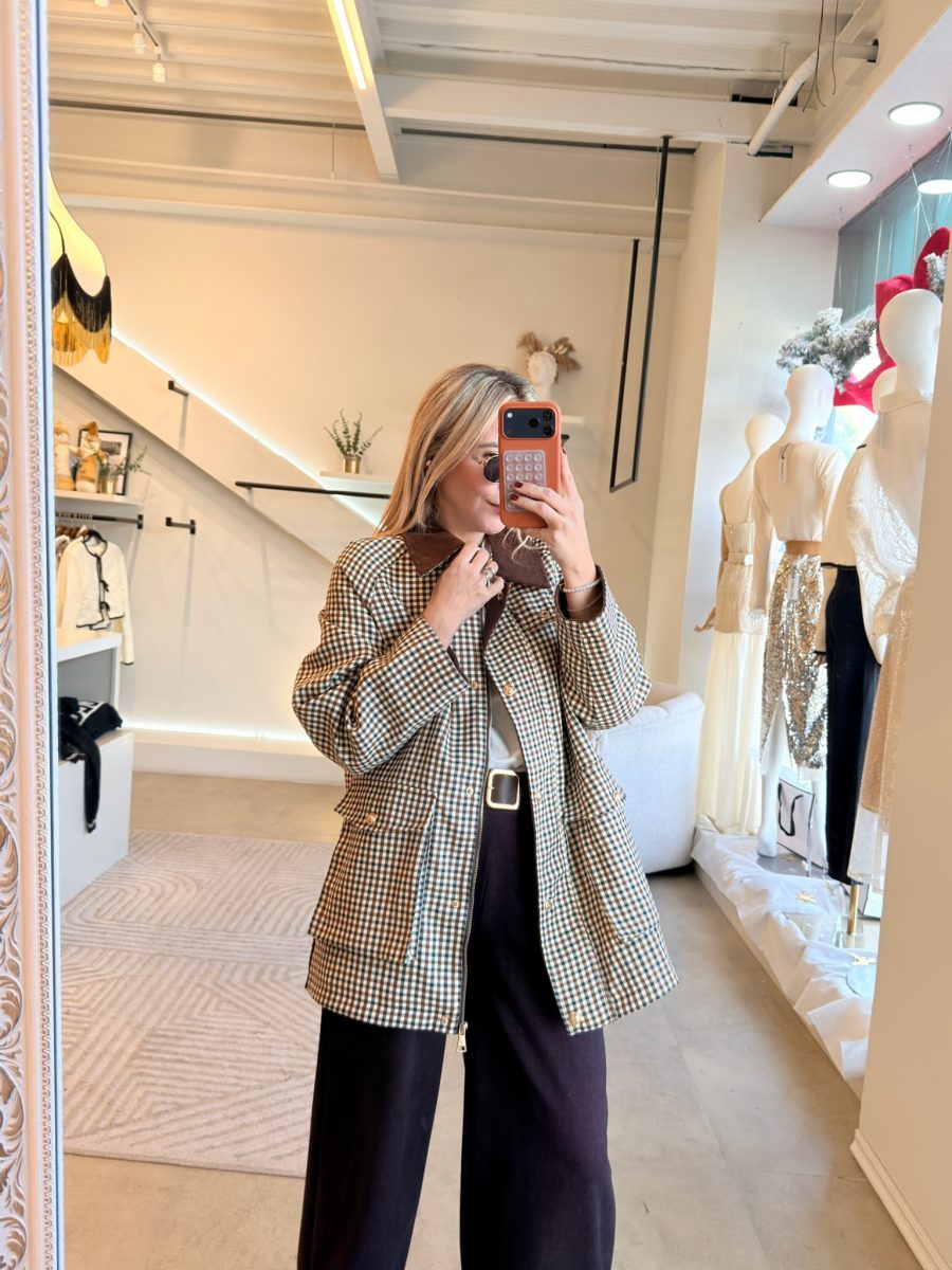 Abrigo color beige estampado cuadros café y negro bolsas al frente