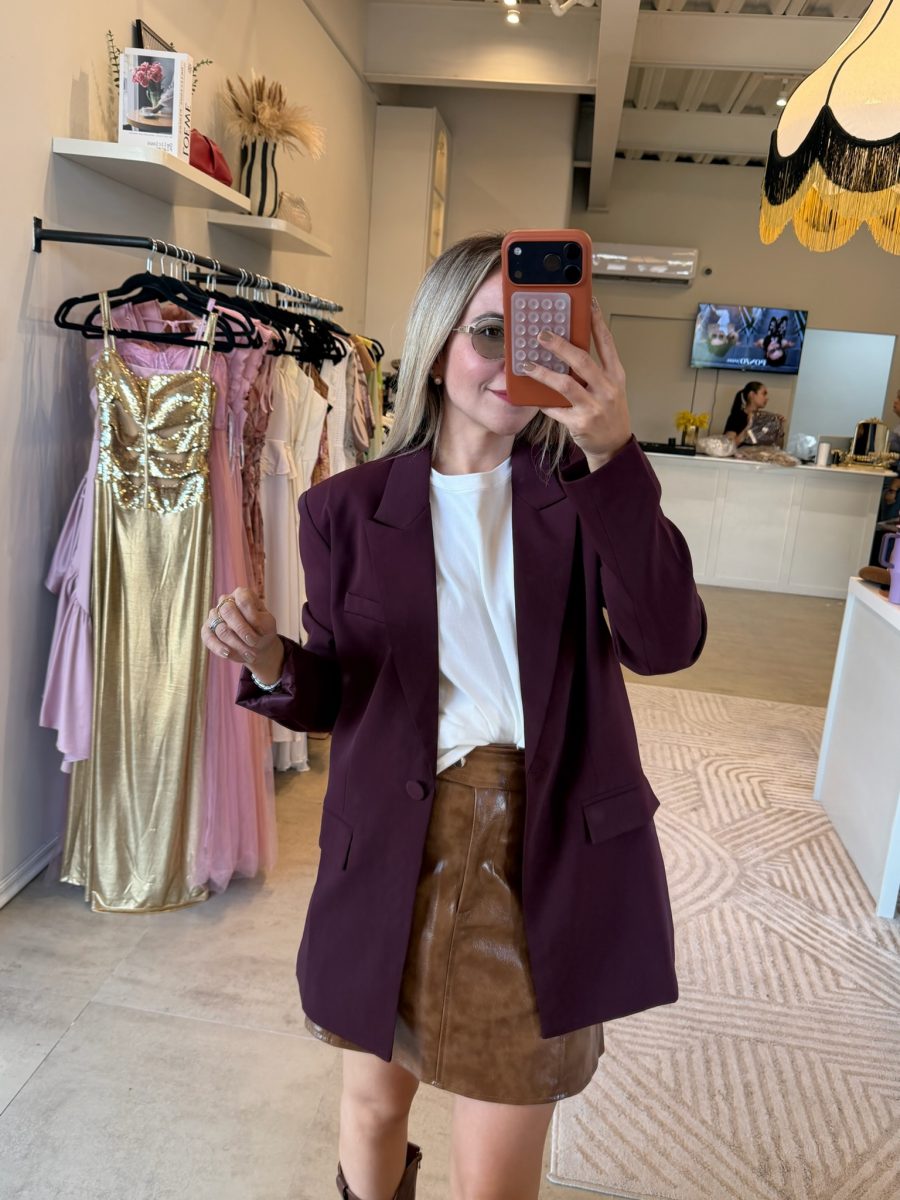 Blazer liso oversize color burgundy oscuro bolsas simuladas tela poliéster