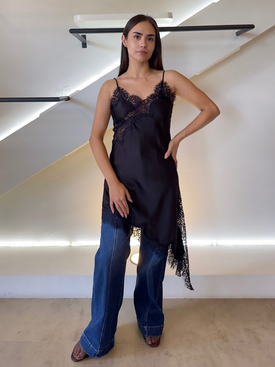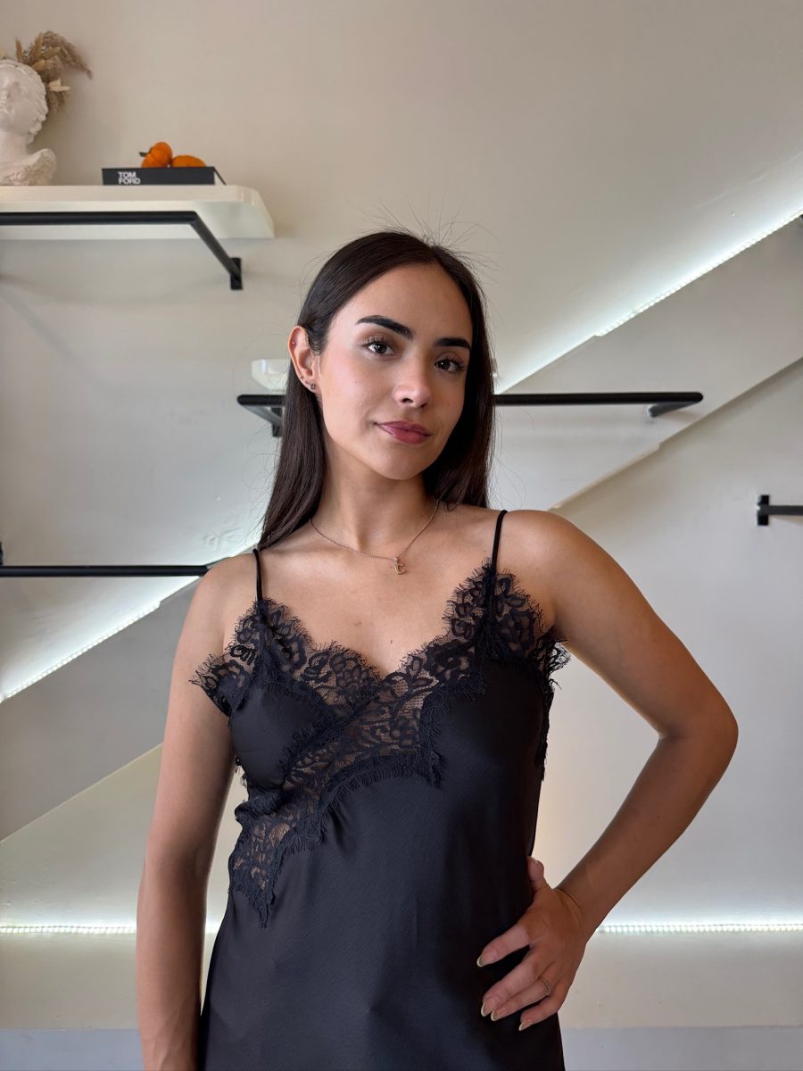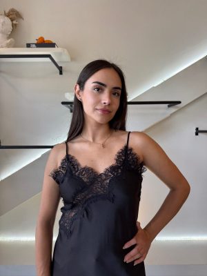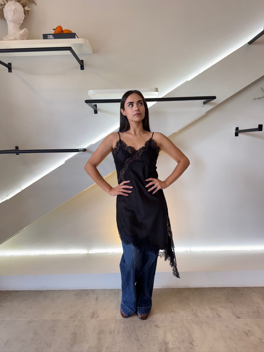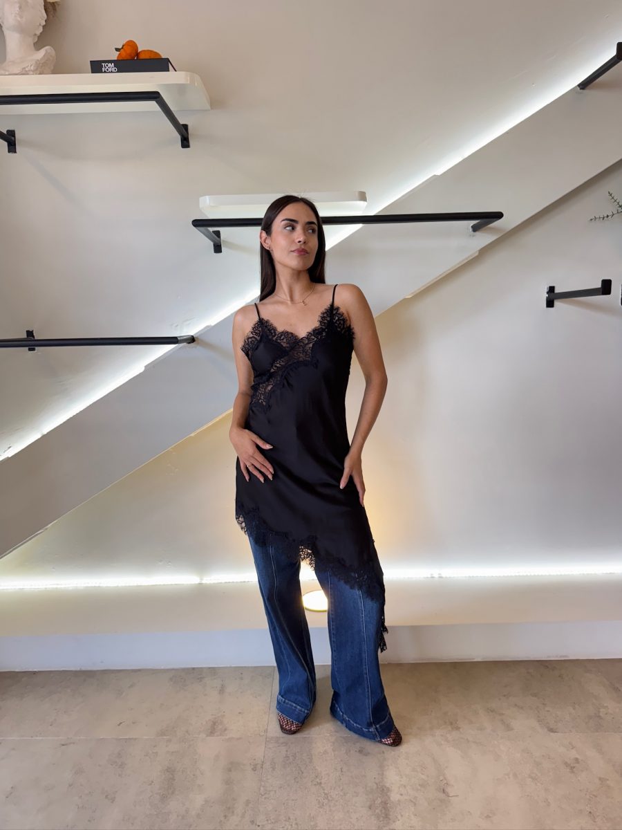 Blusa tirante asimétrica color negro tela satinada con encaje