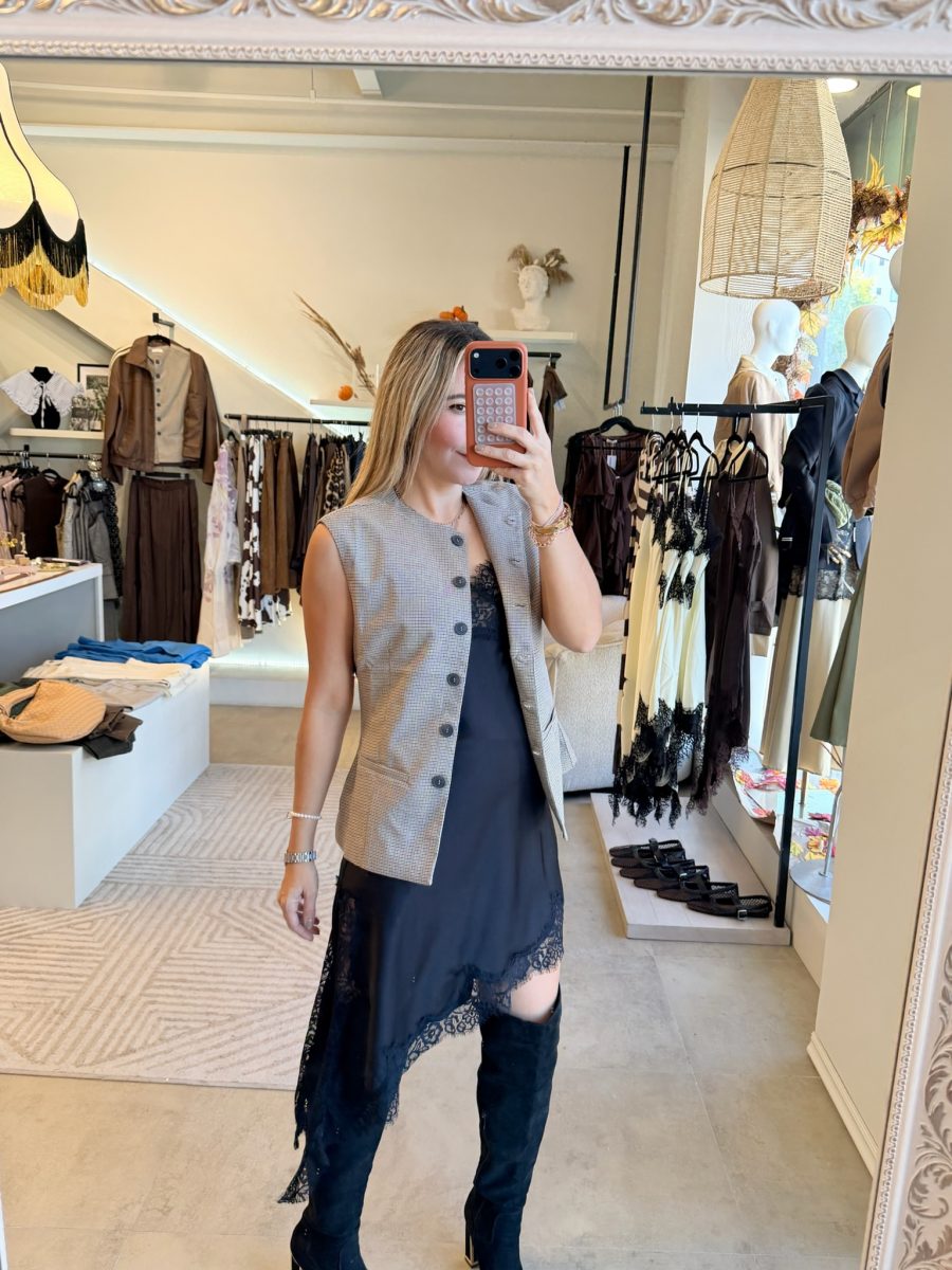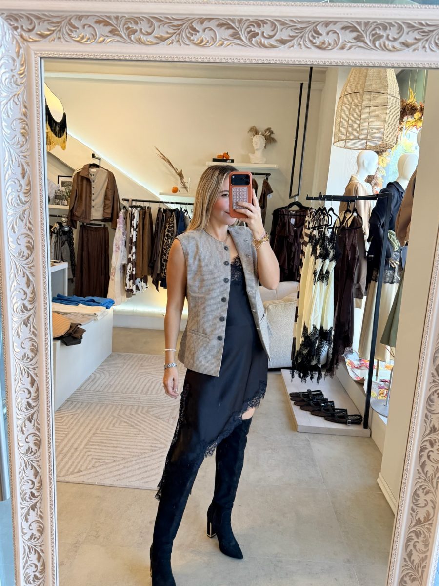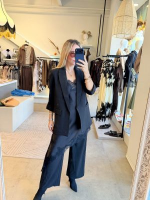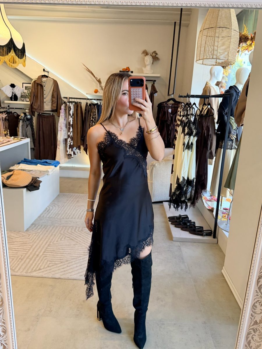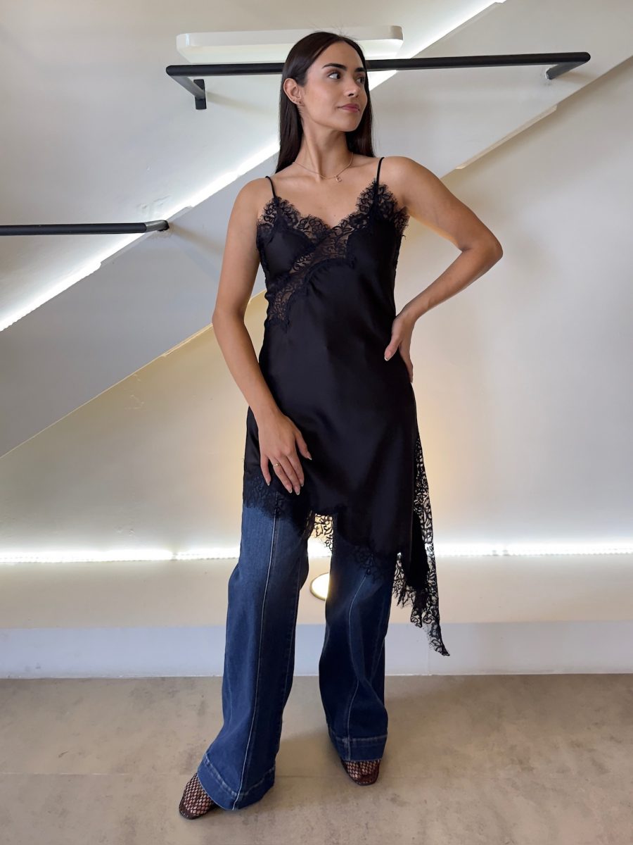 Blusa tirante asimétrica color negro tela satinada con encaje