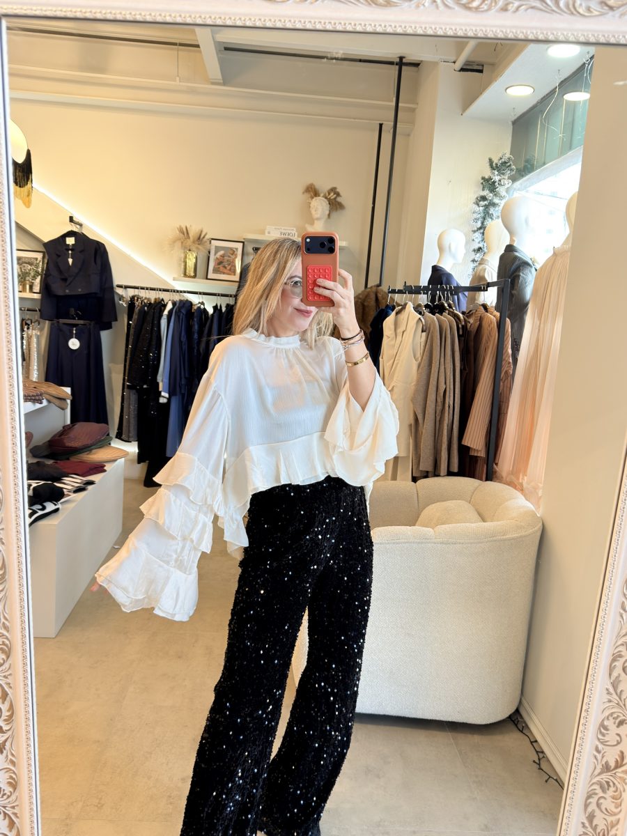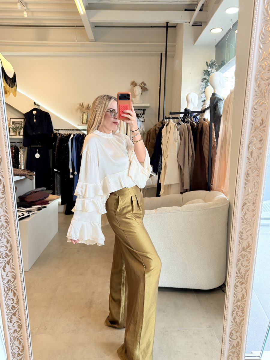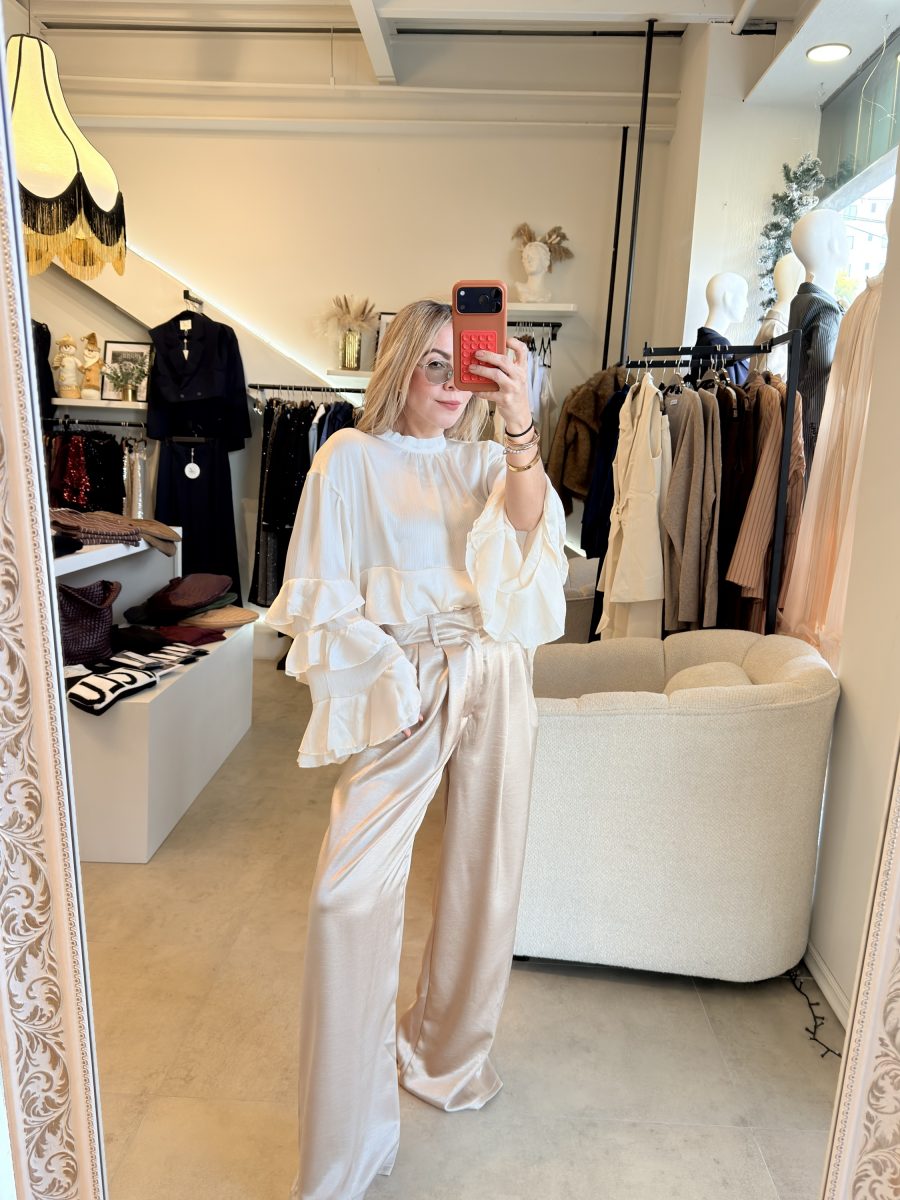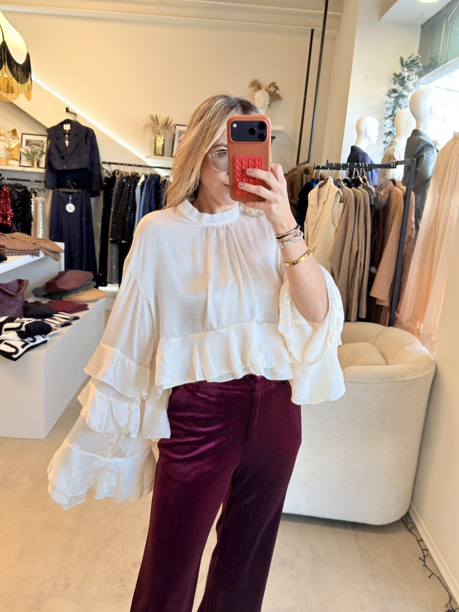 Blusa color a perlado, cuello redondo y diseño de Olanes en mangas y en la parte inferior de la prenda