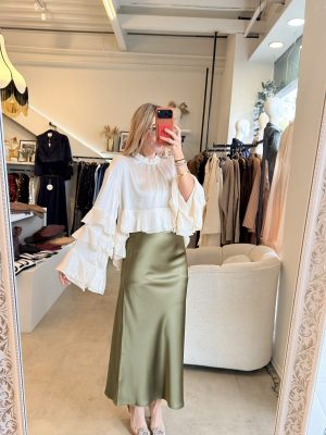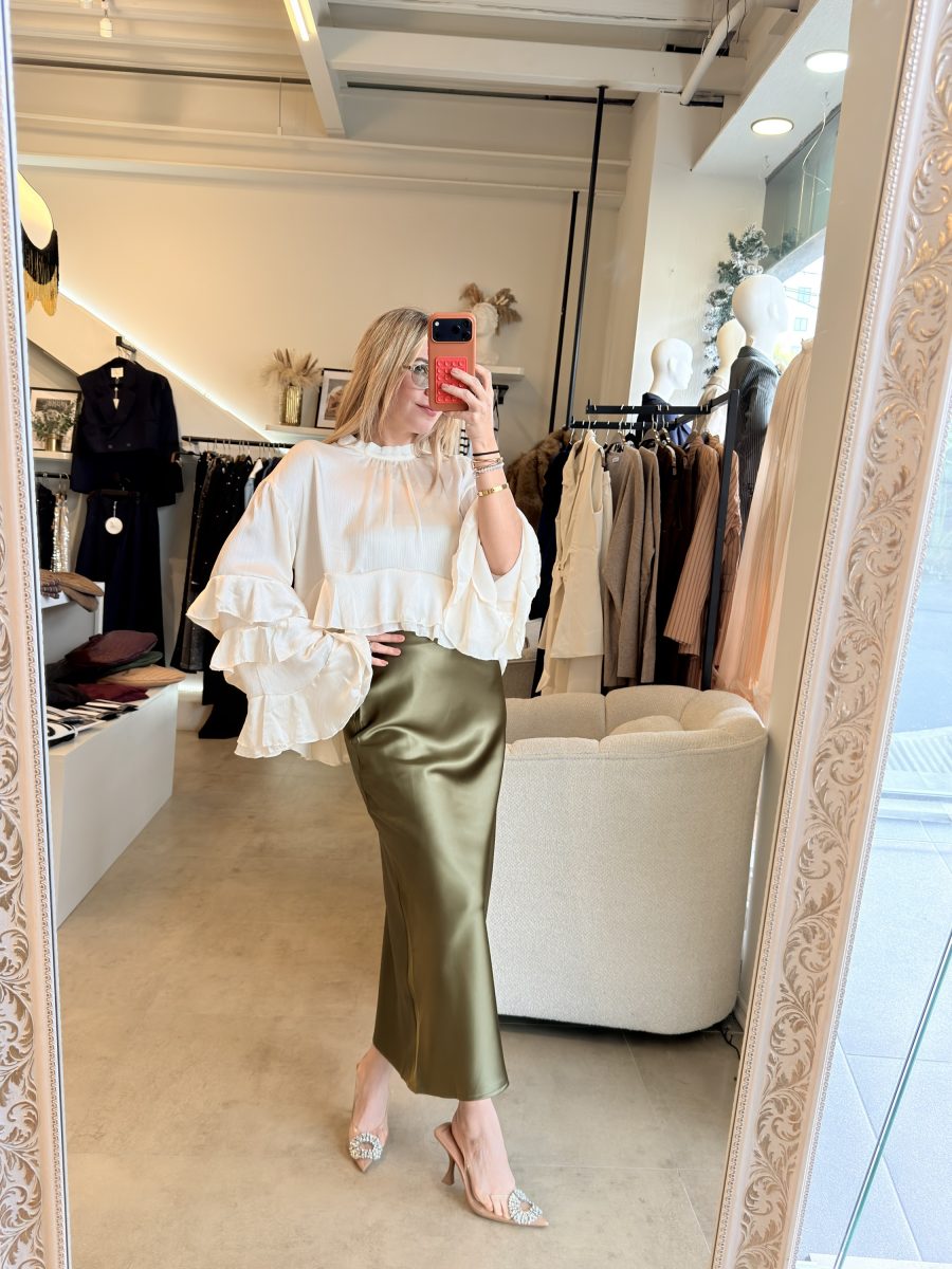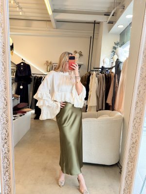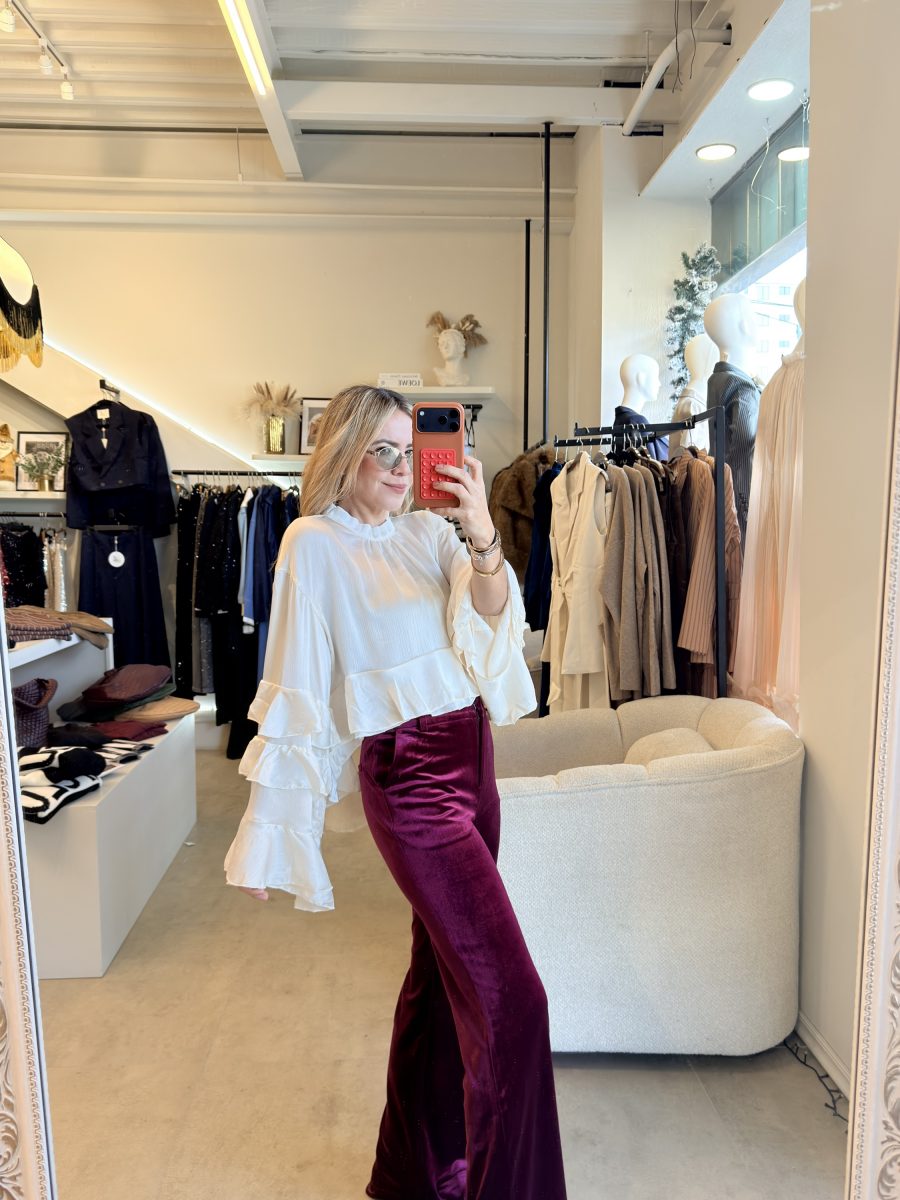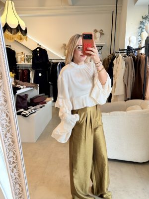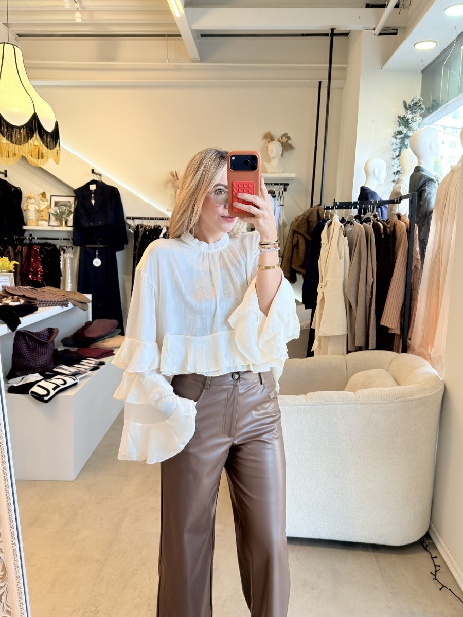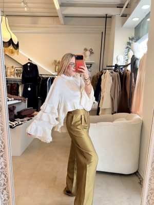Blusa color a perlado, cuello redondo y diseño de Olanes en mangas y en la parte inferior de la prenda