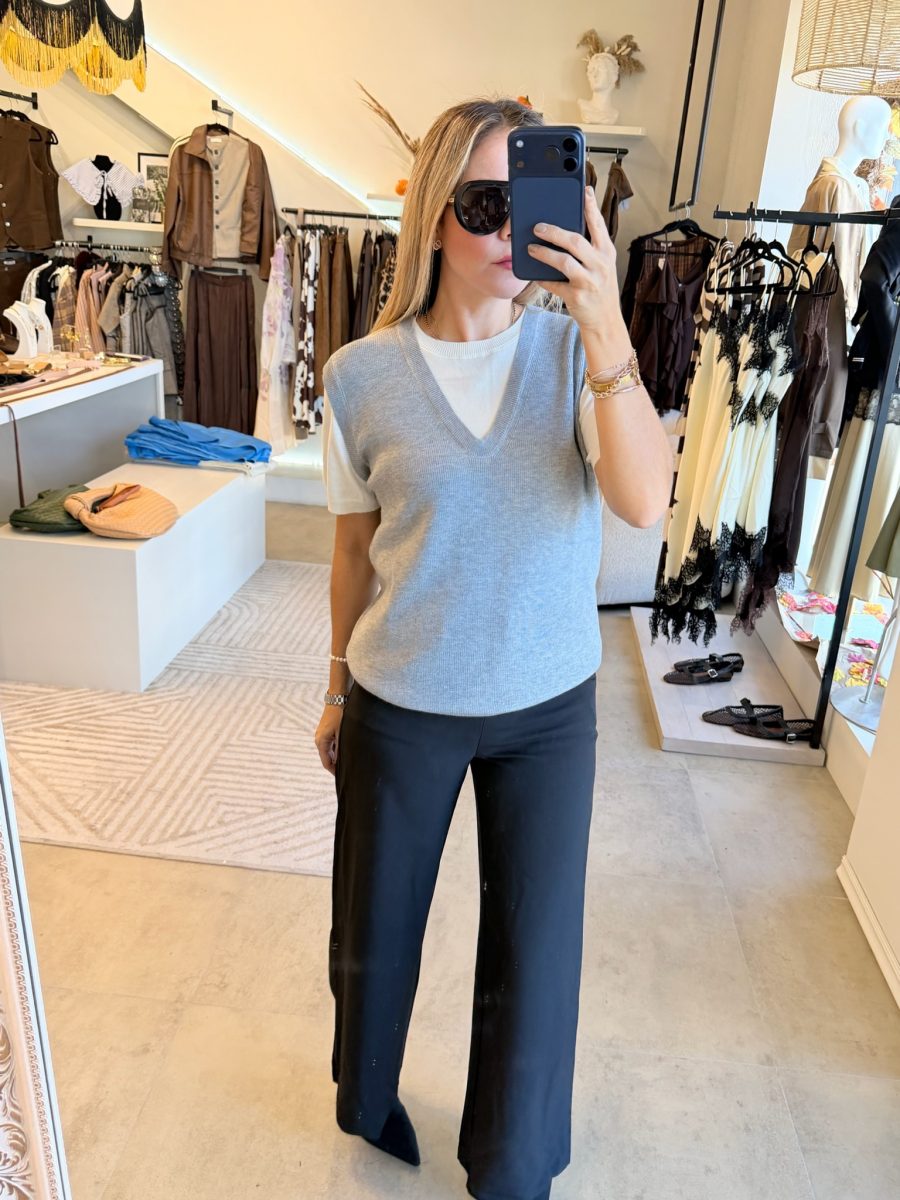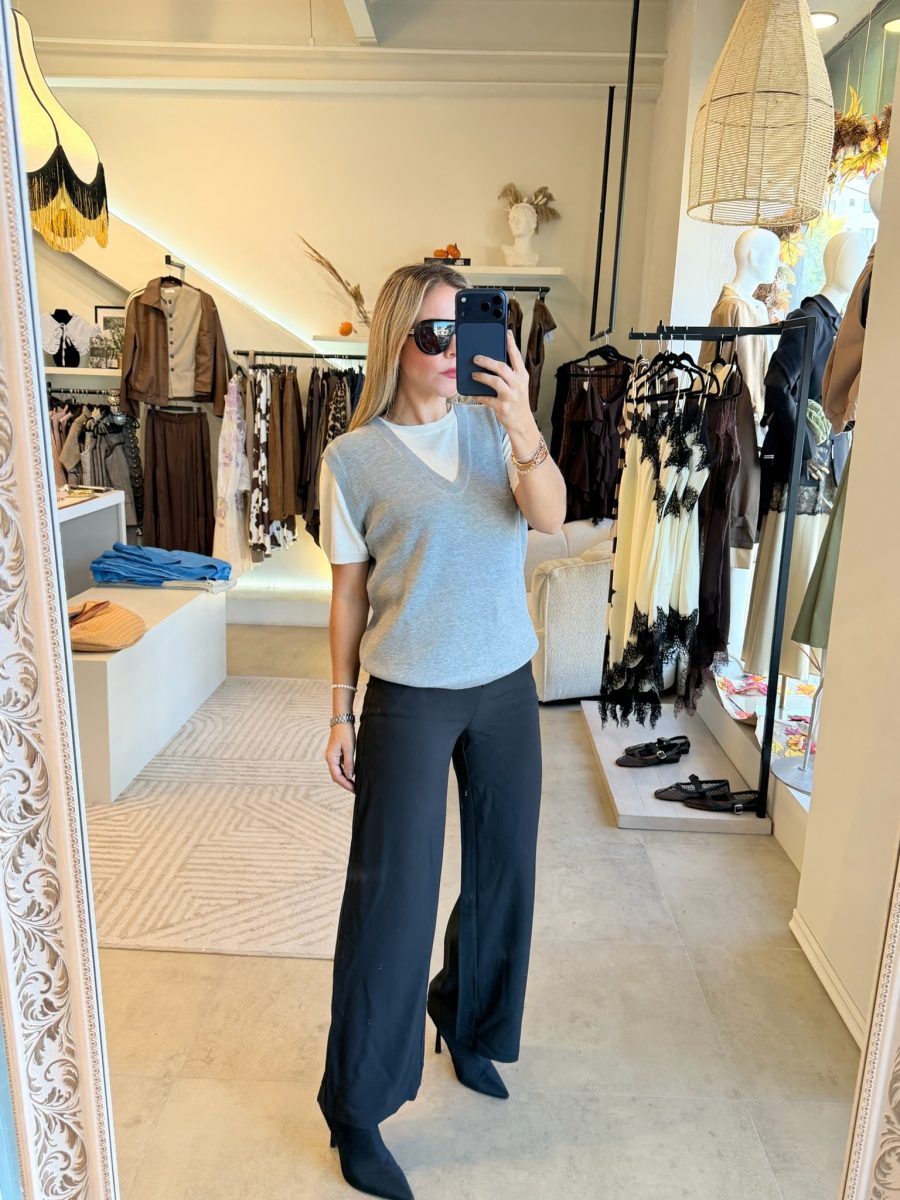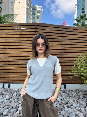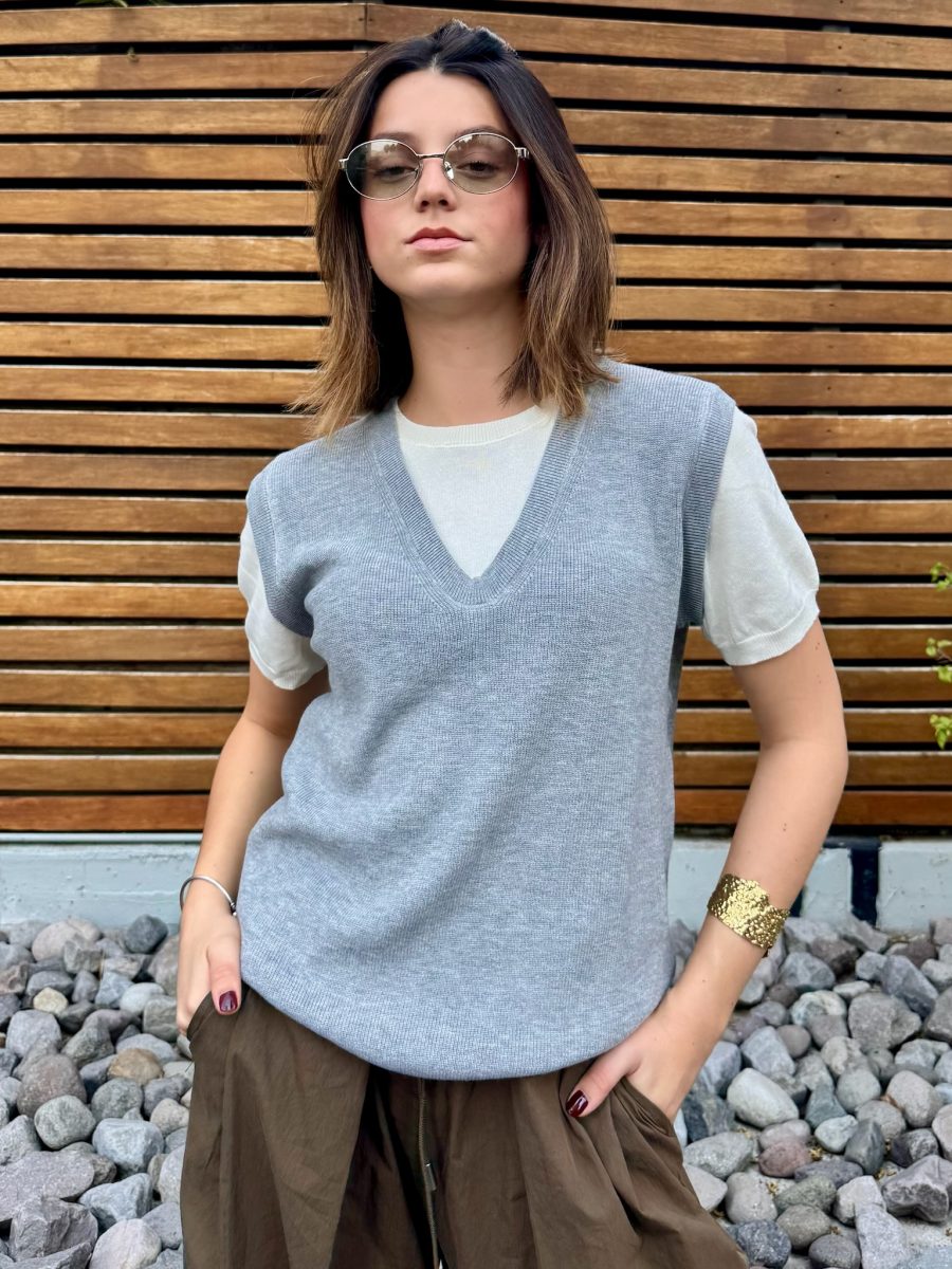 Blusa básica blanca de cuello redondo con chaleco color gris