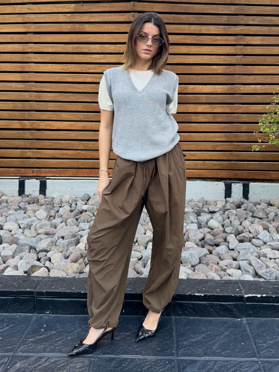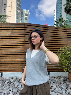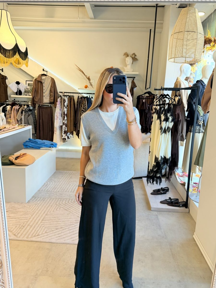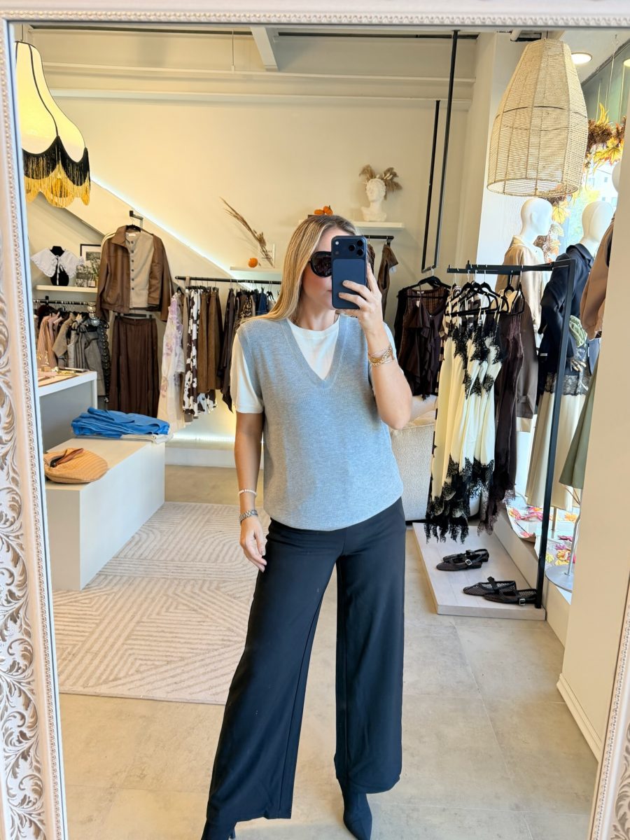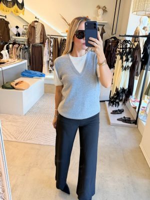 Blusa básica blanca de cuello redondo con chaleco color gris