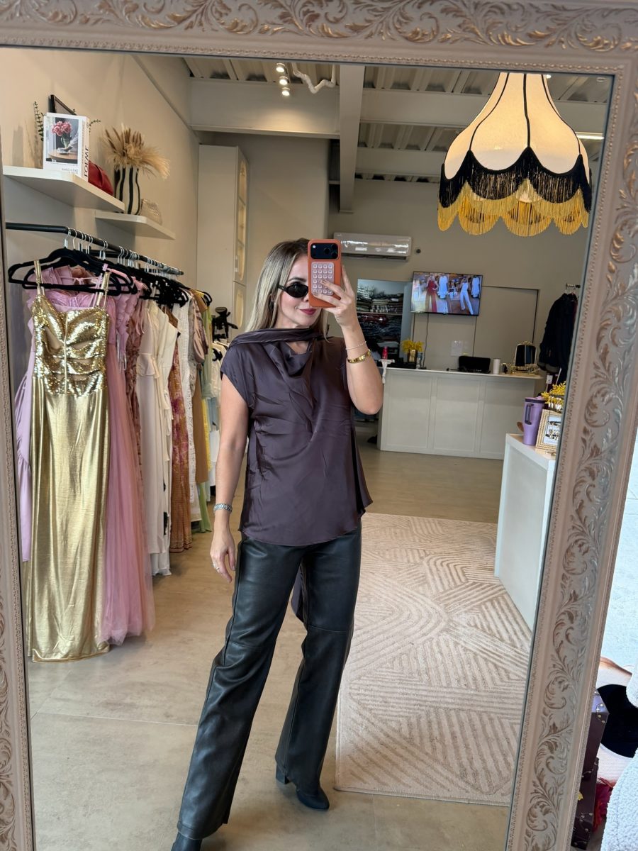 Blusa sin manga lisa con corbatín tela satinada color cafe