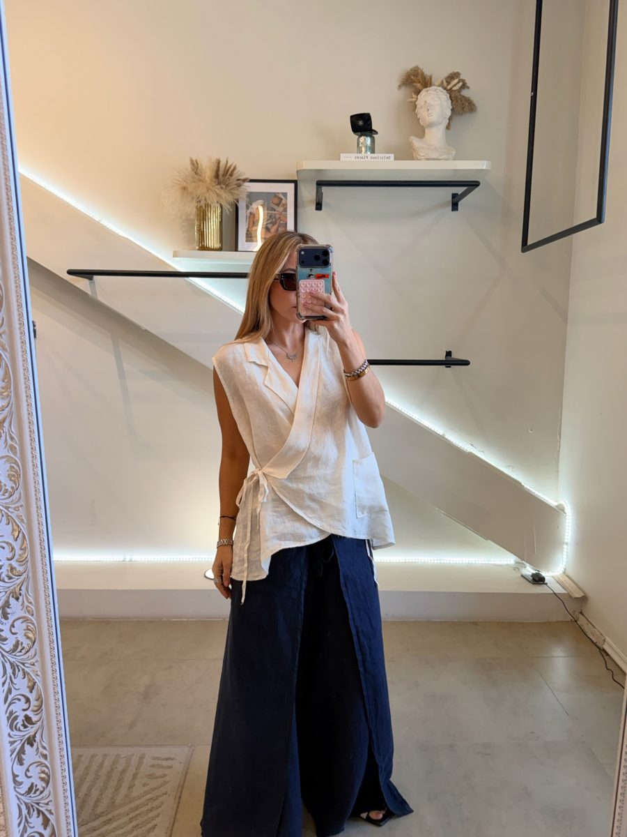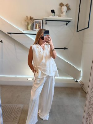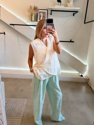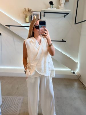 Blusa sin manga cruzada con amarre tela de lino color beige