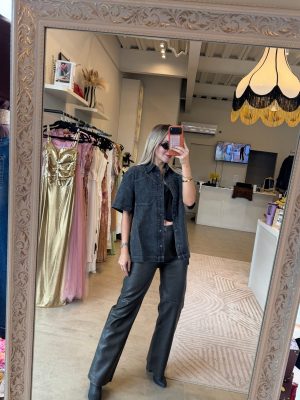 Blusa de mezclilla color negro deslavado, con botones en la parte de enfrente y manga corta.