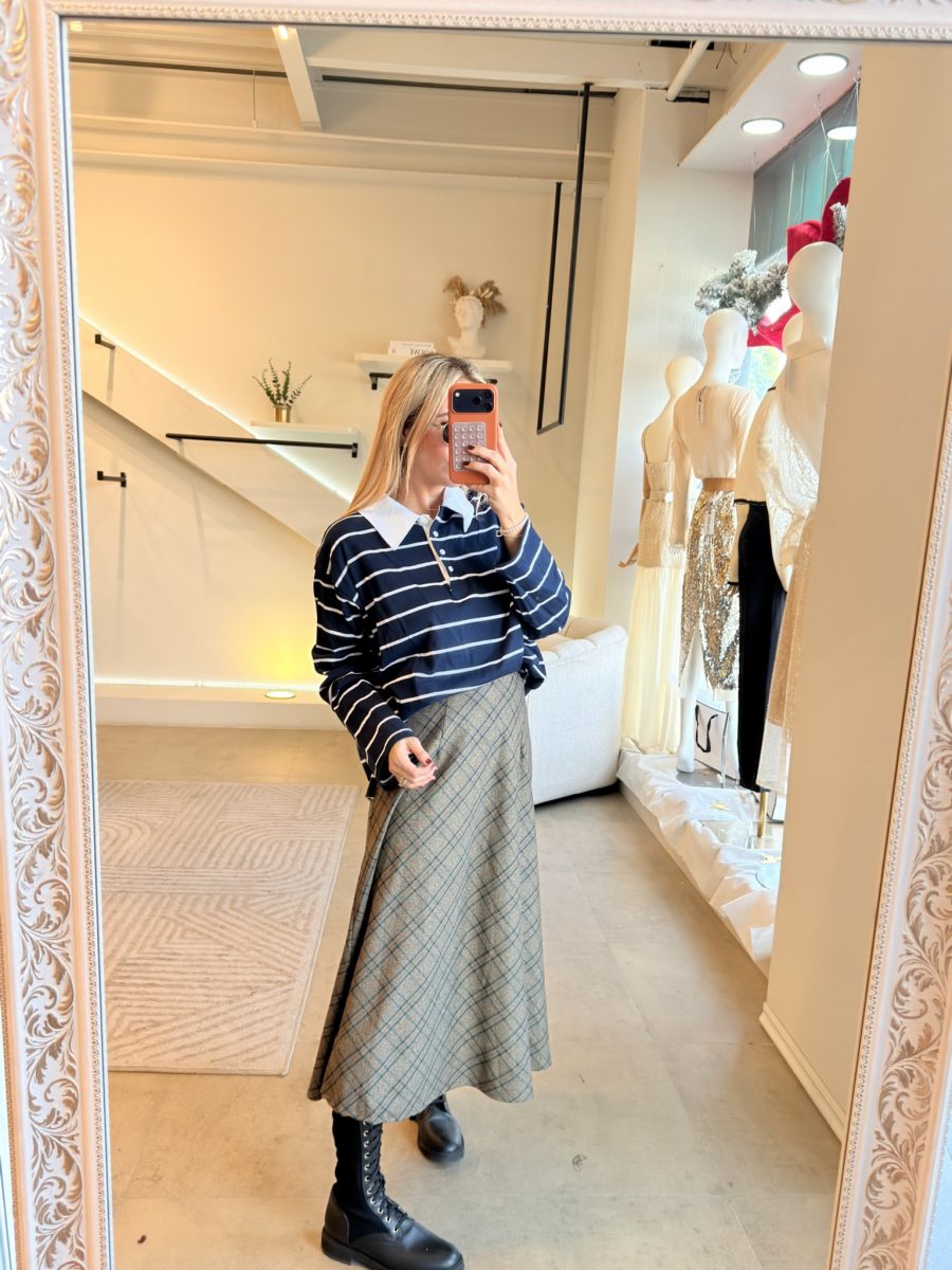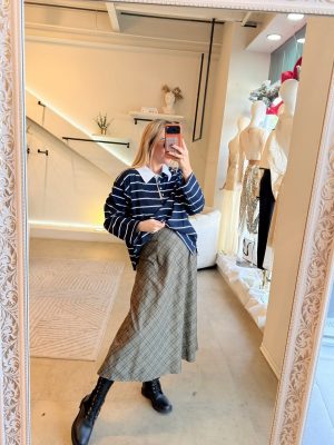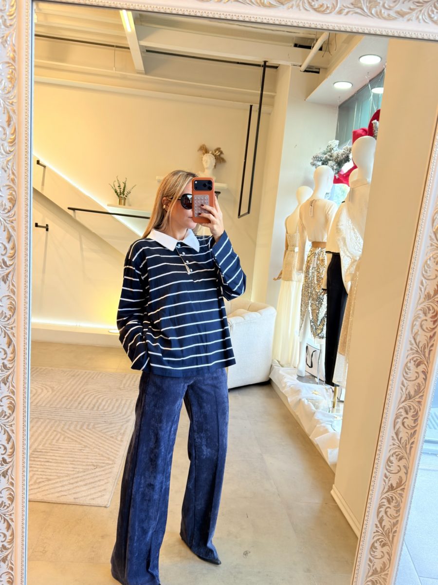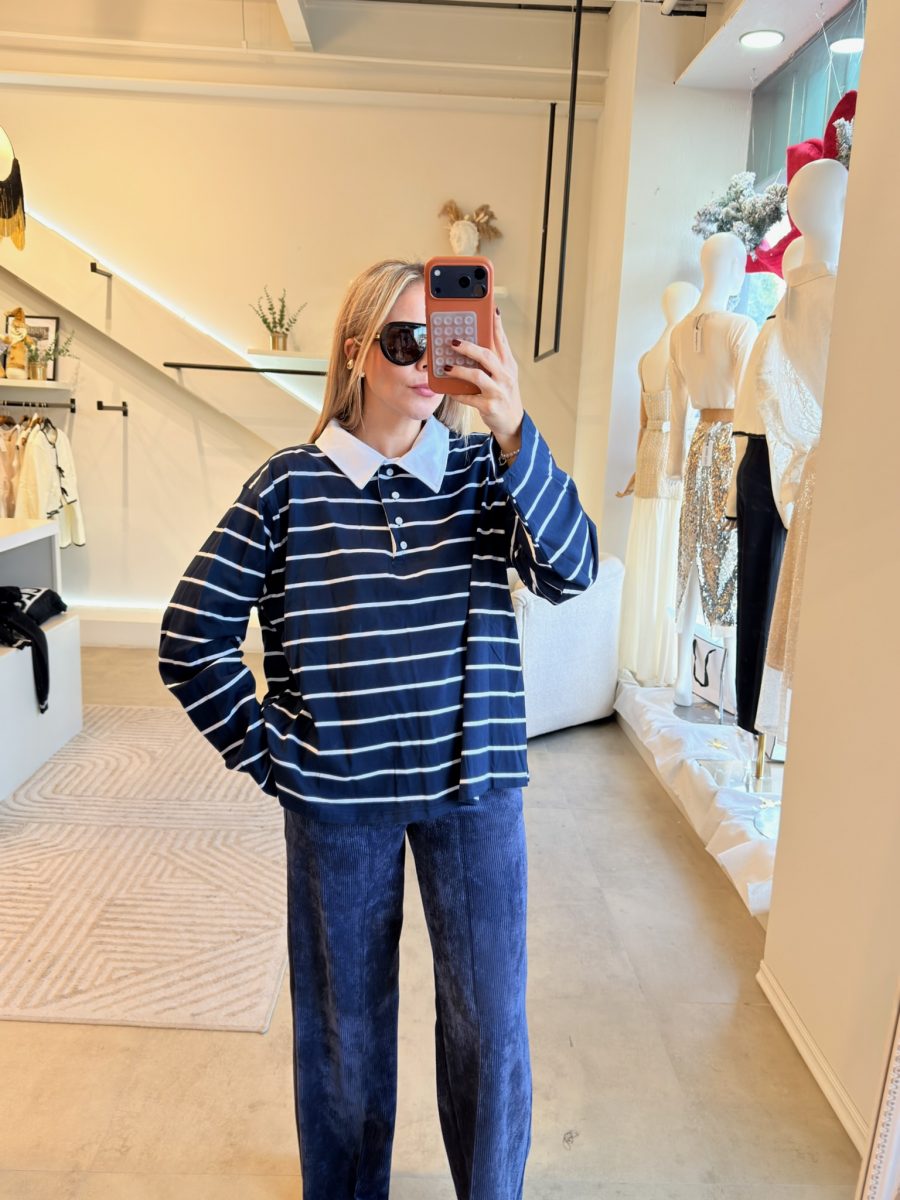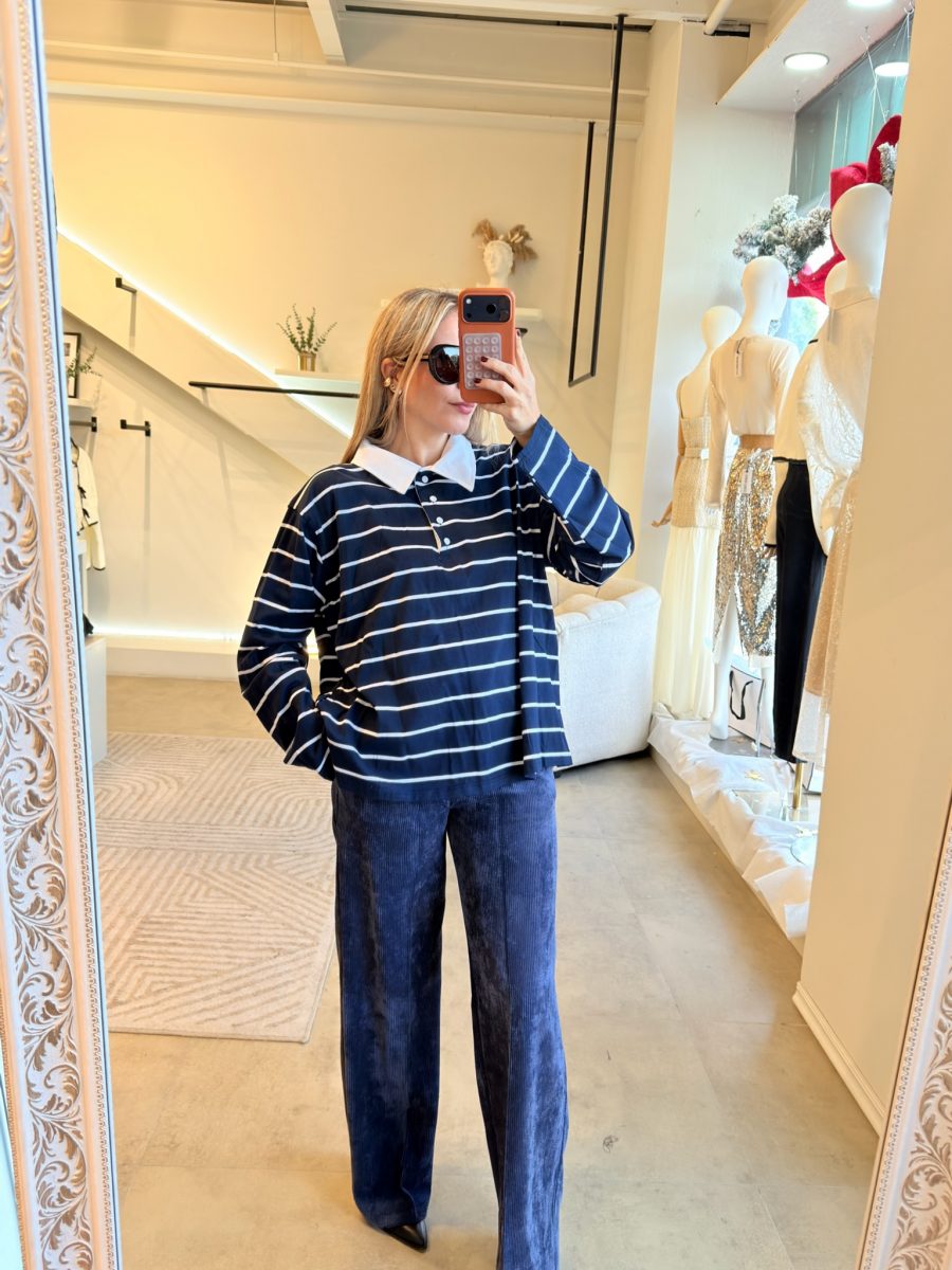 Blusa manga larga cuello en solapa color azul marino con rayas blancas tela de algodón