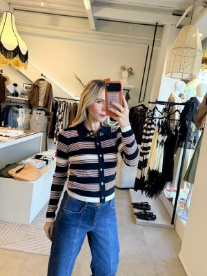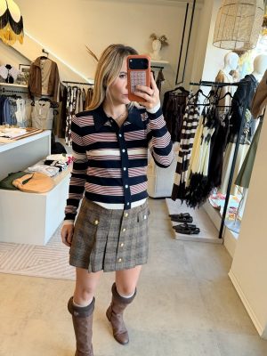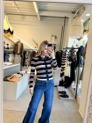 Blusa manga larga con botones al frente color negro con líneas beige y burgundy