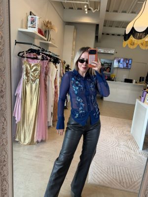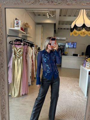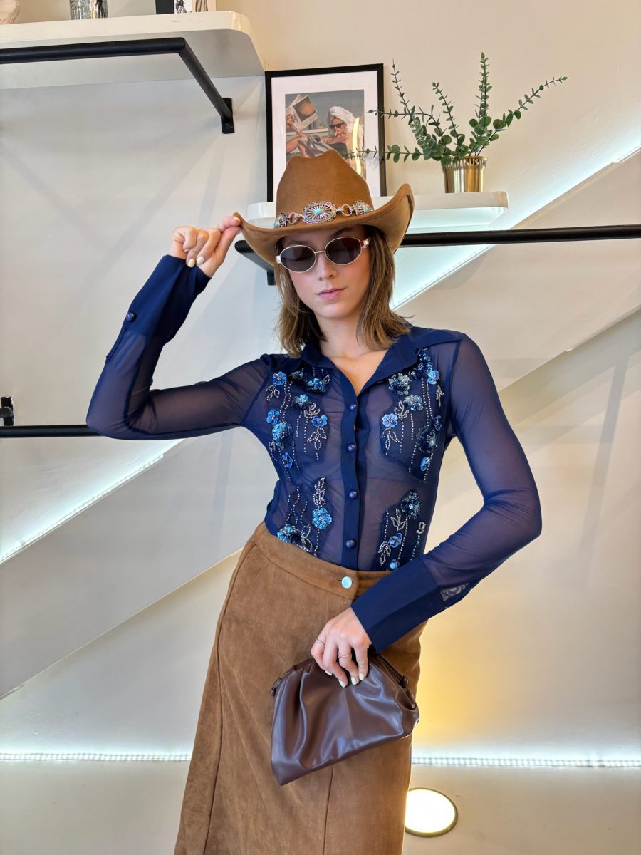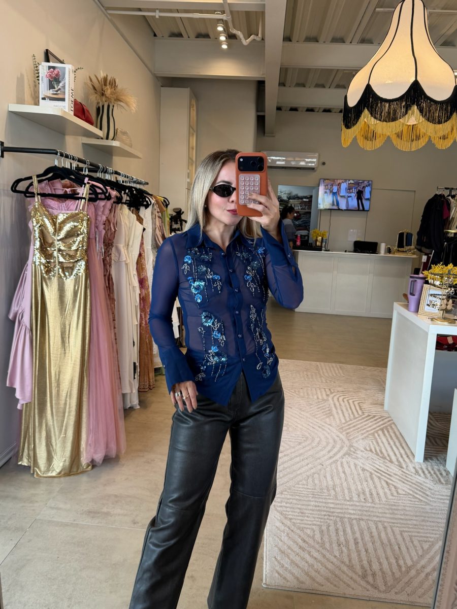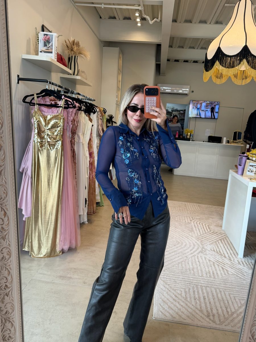Blusa transparente color azul rey con detalle de flores bordado con aplicaciones
