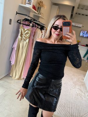 Blusa off shoulder color negro de encaje con diseño de flores y fruncido en laterales.