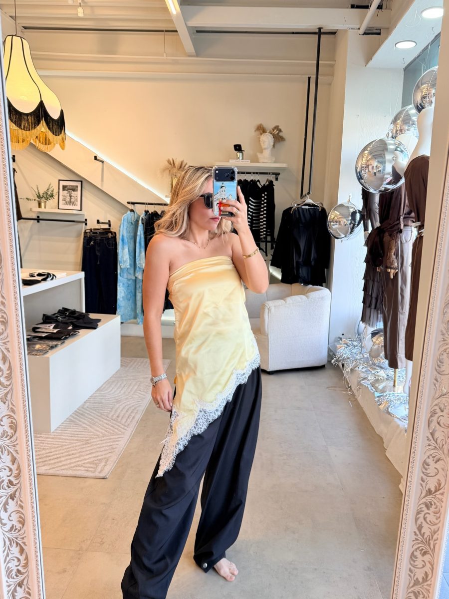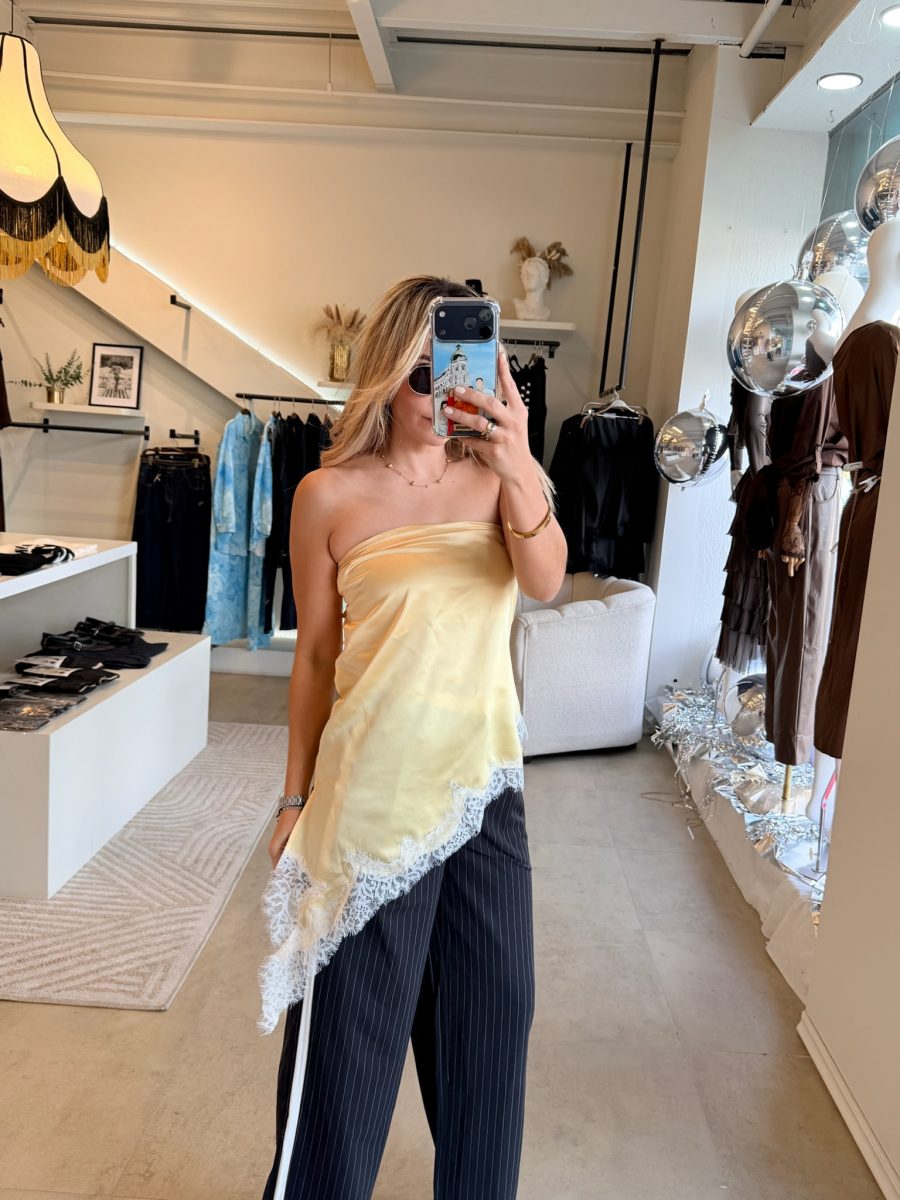 Blusa satinada strapless color amarillo con encaje blanco.