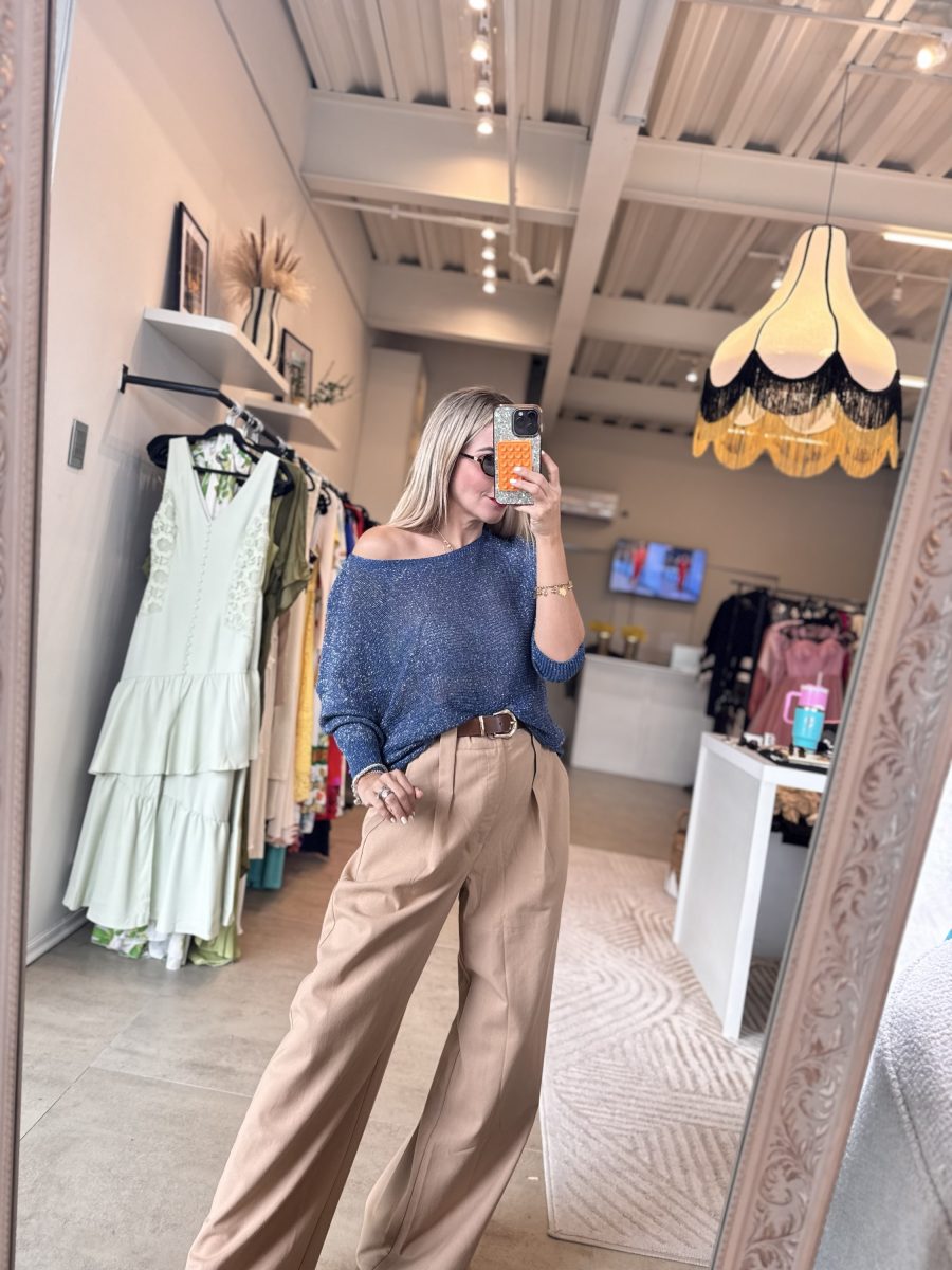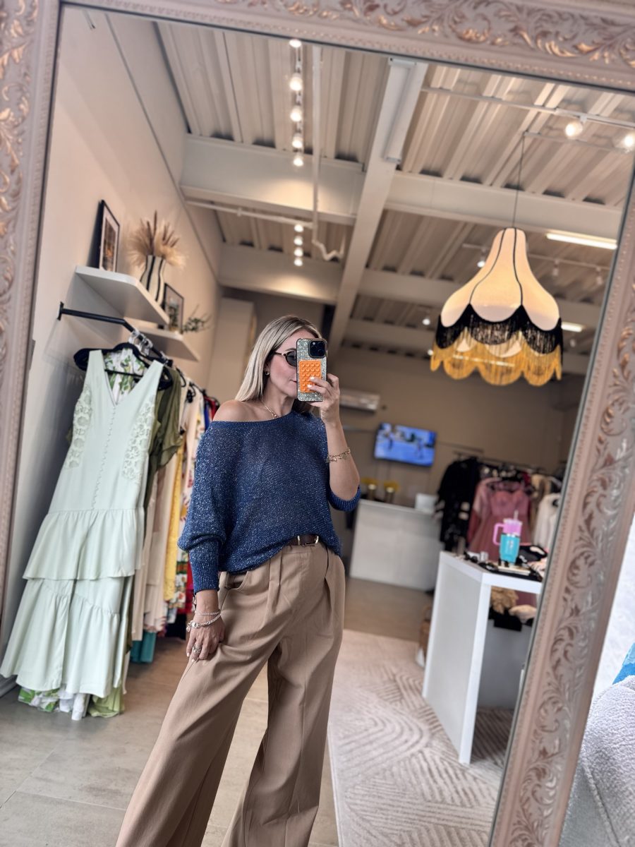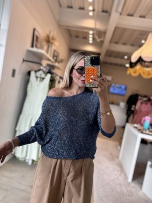 Blusa manga larga color azul tela tejida con brillos