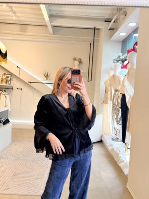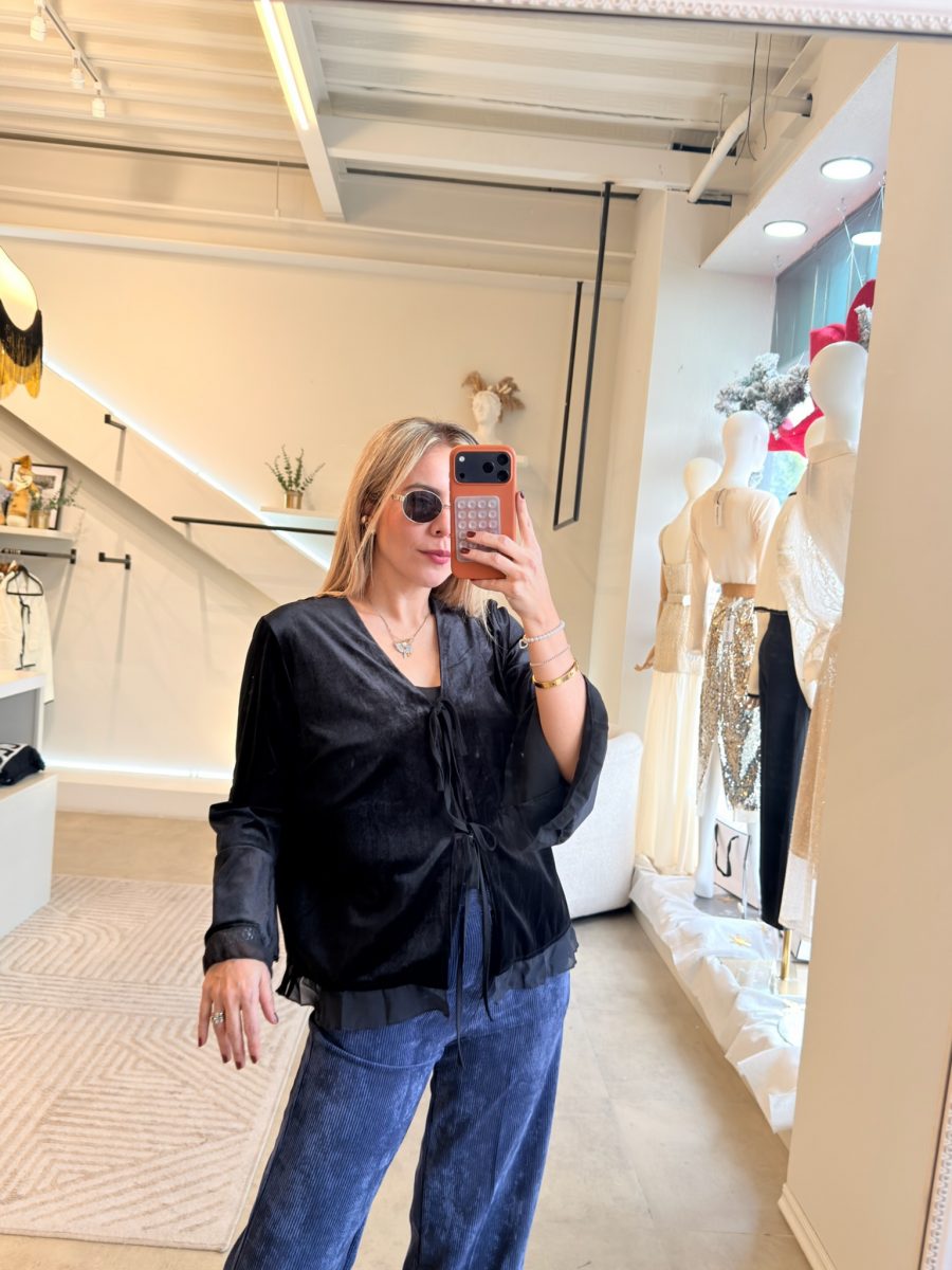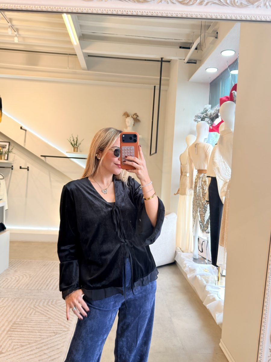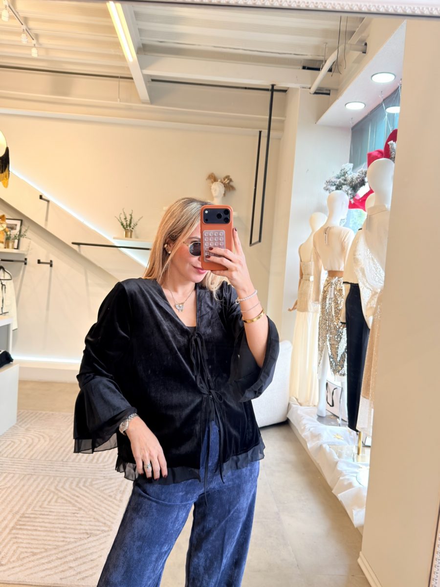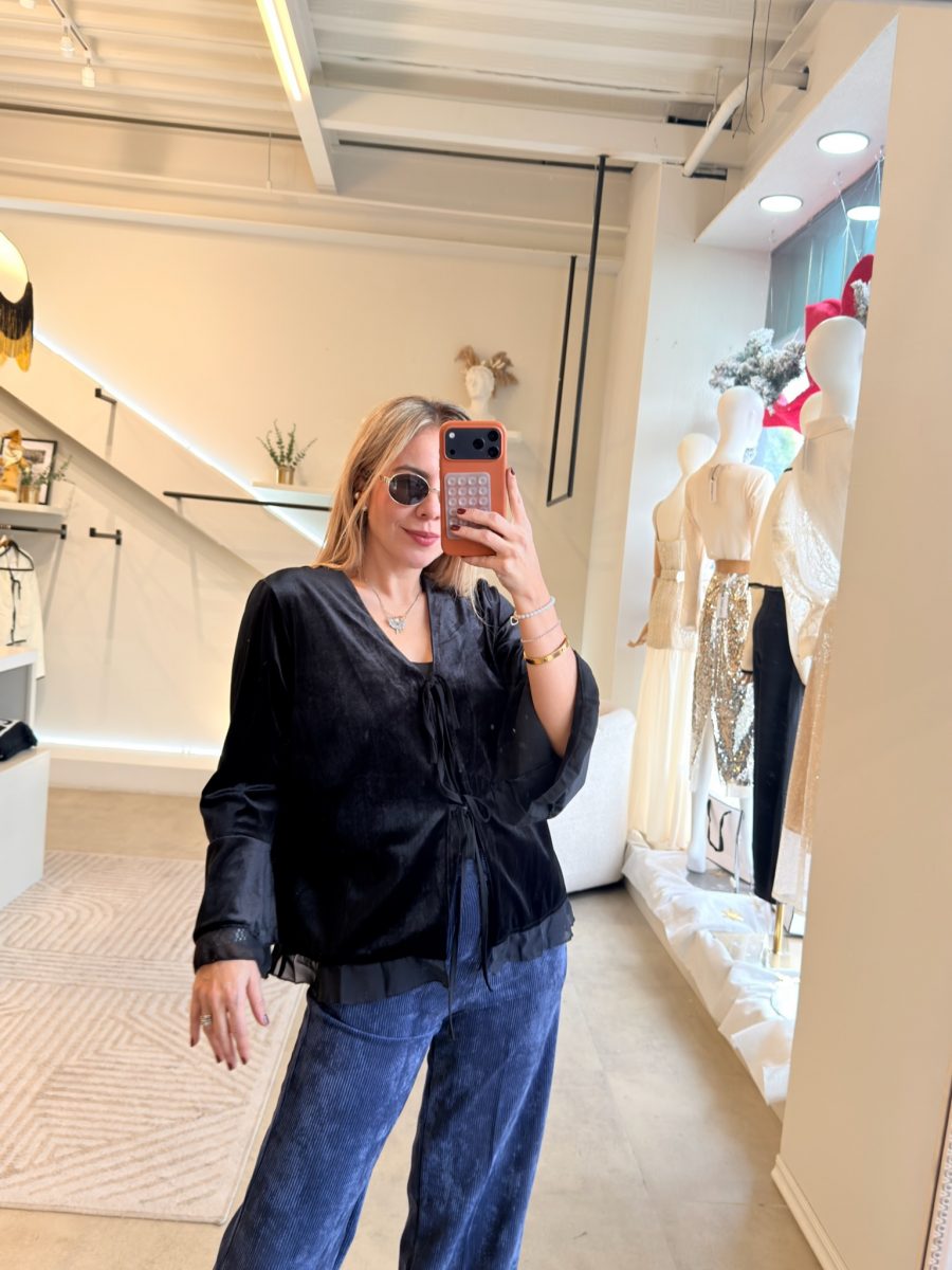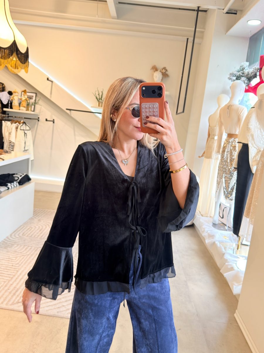 Blusa manga larga tela de terciopelo color negro con amarre de moño al frente