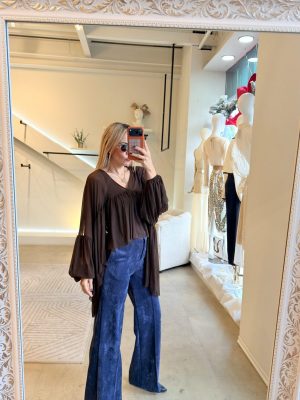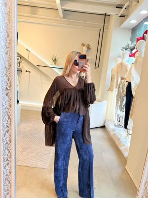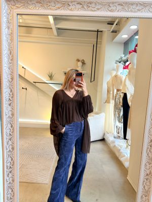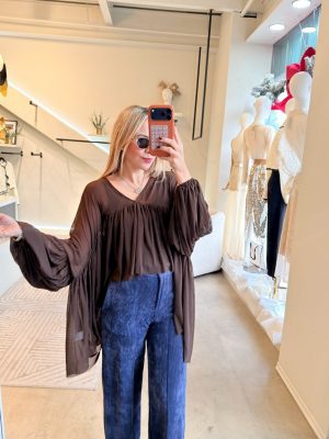 Blusón mesh color brown con olanes y manga larga.
