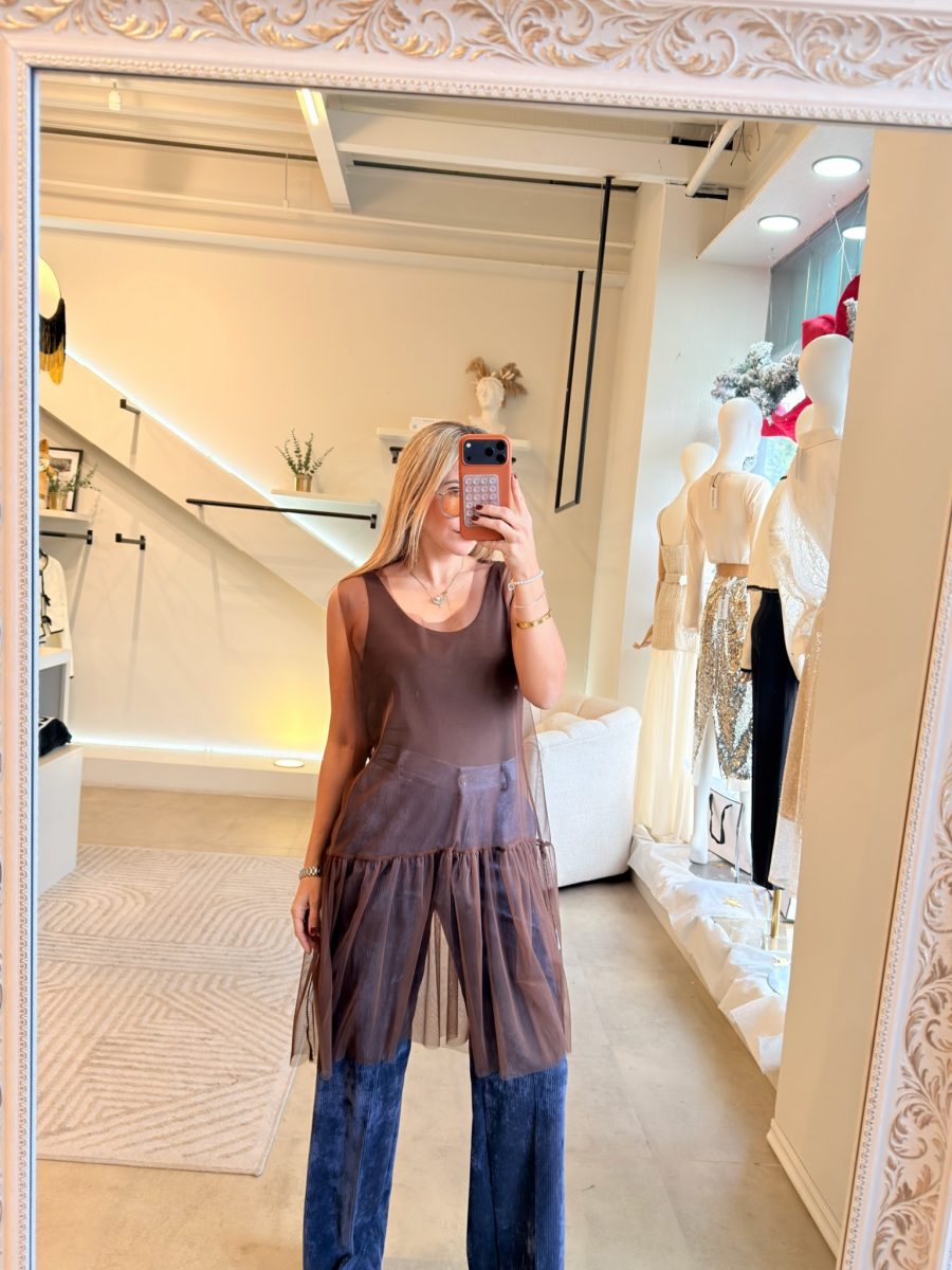 Blusón mesh brown sin mangas, cuello redondo y Olanes en la parte de abajo