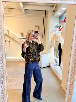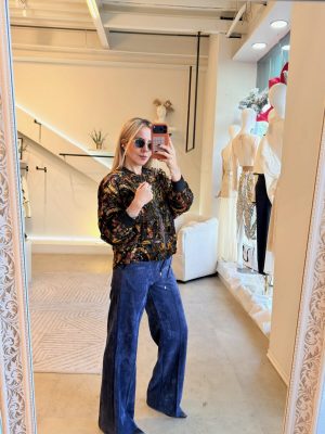 Jacket con cierre color negro con aplicaciones en gamuza de colores rojos, amarillos y dorados.
