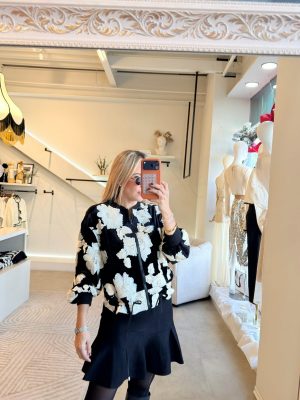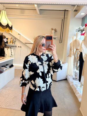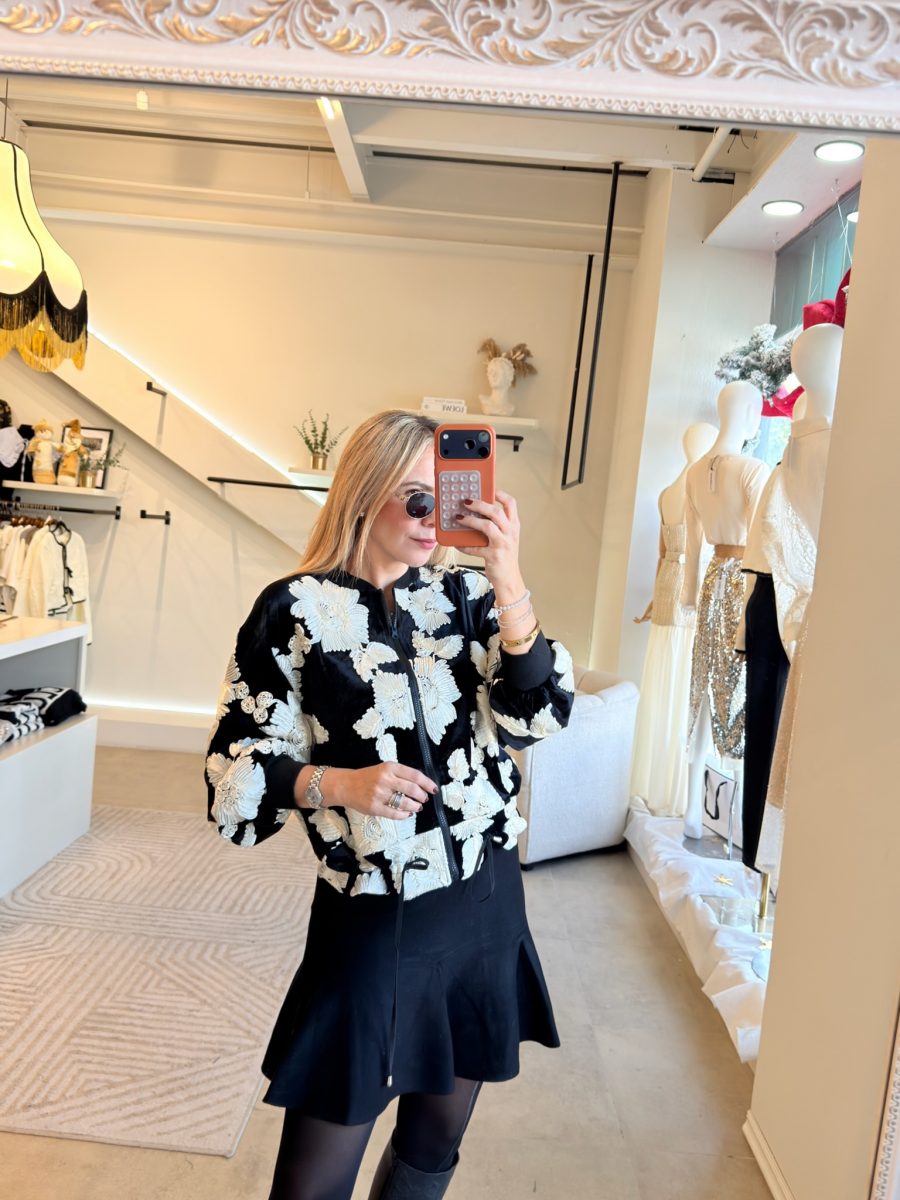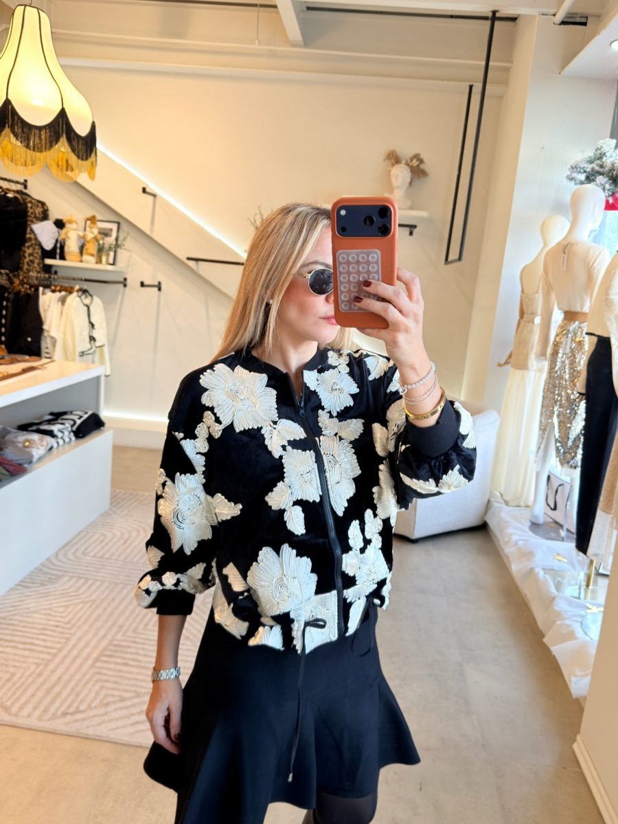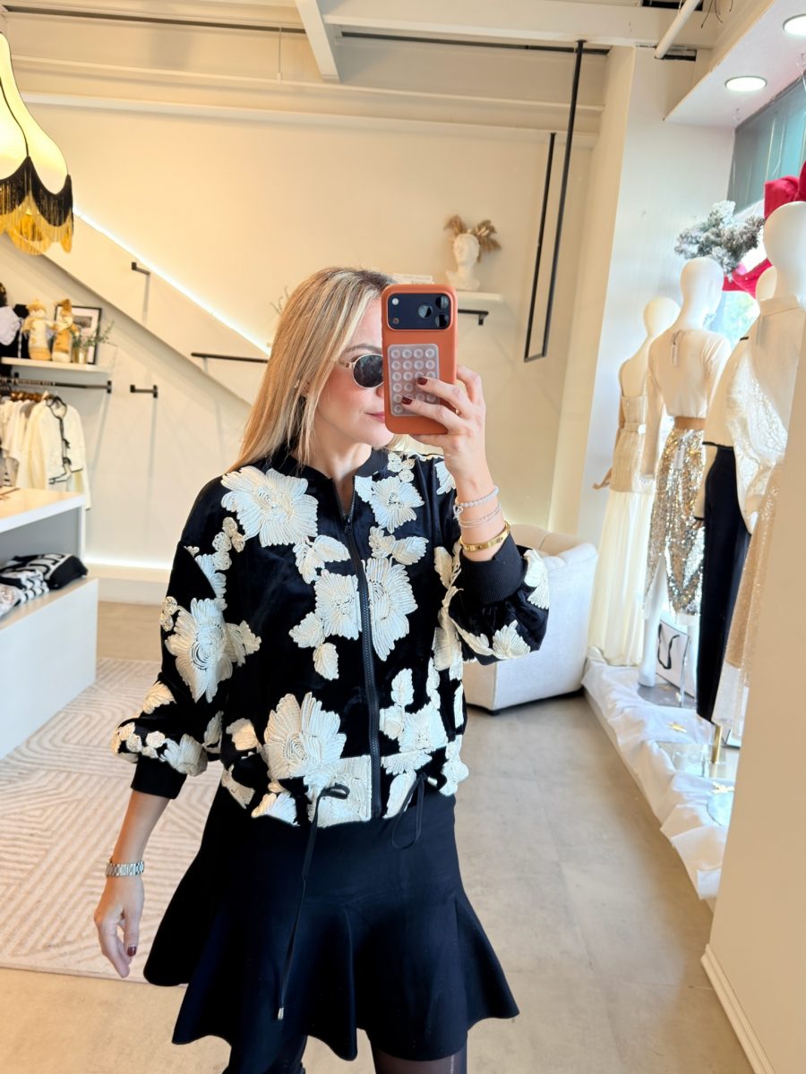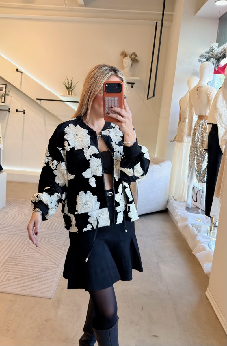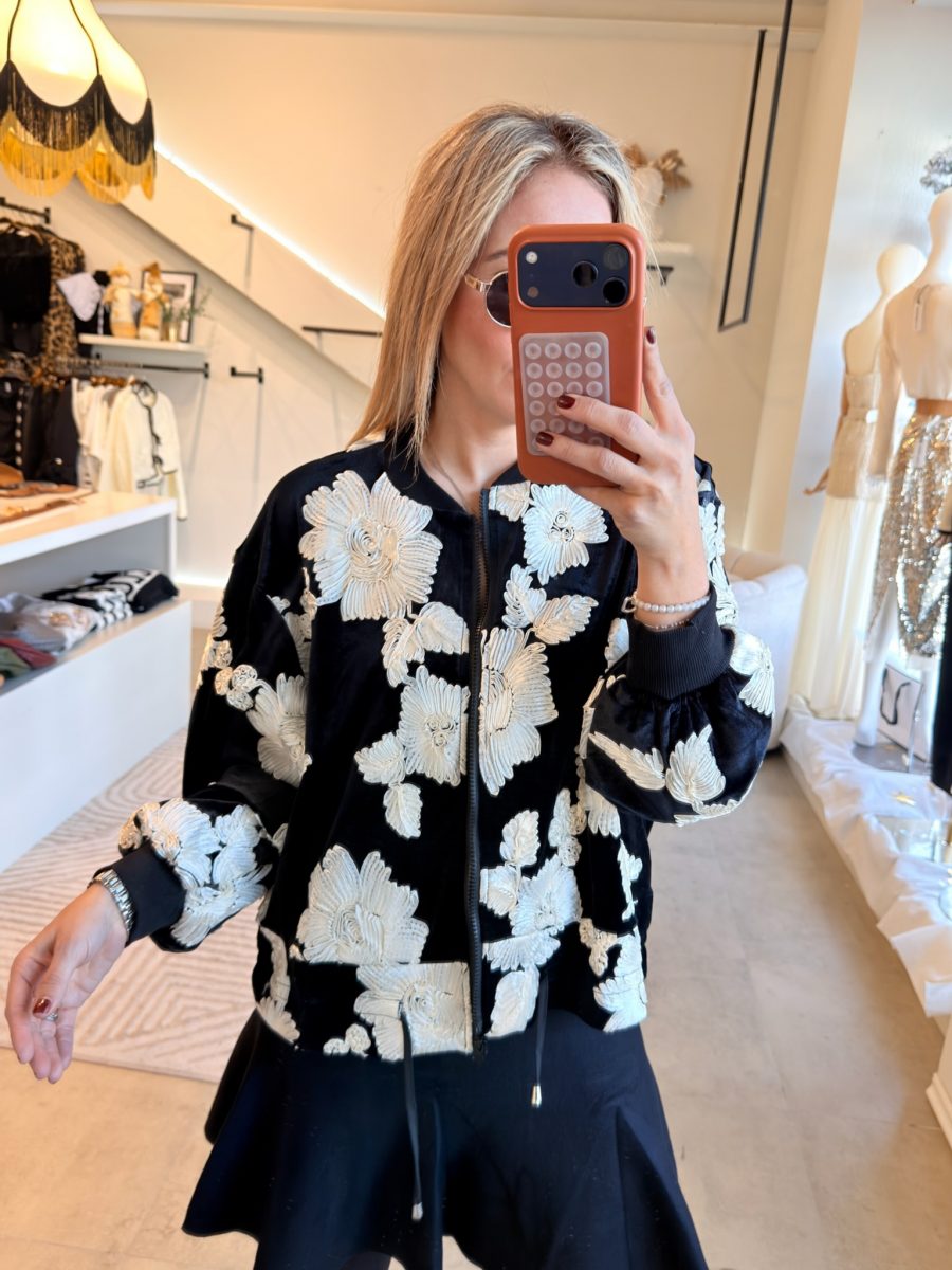 Jacket terciopelo con cierre color negra y bordado de flores color blanca