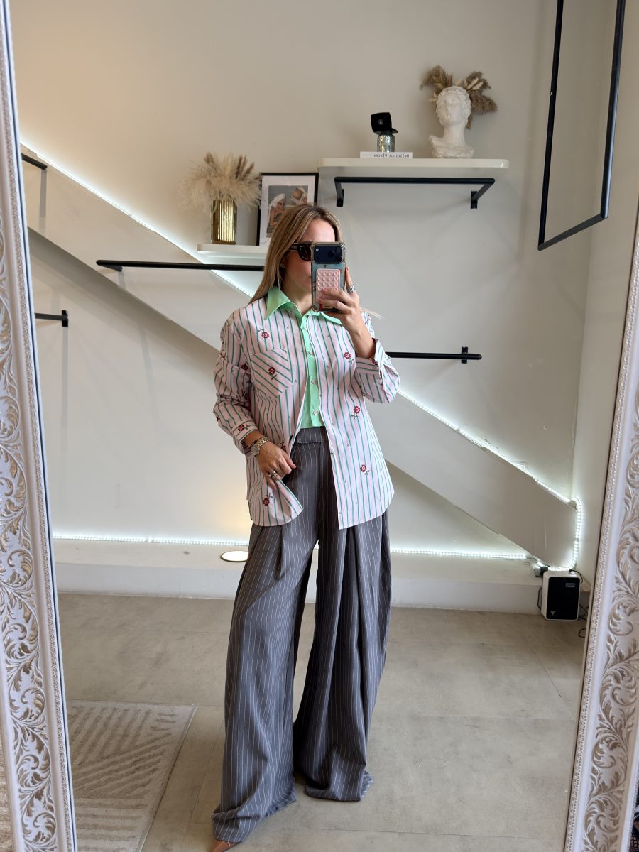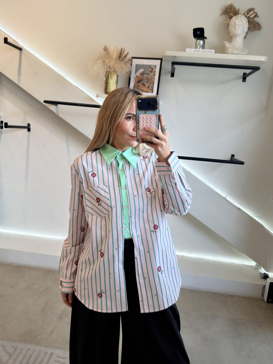 Camisa green línea con cuello rosa y diseño de flores bordadas