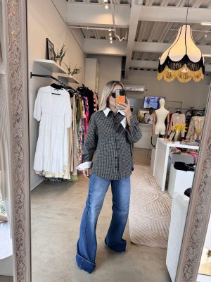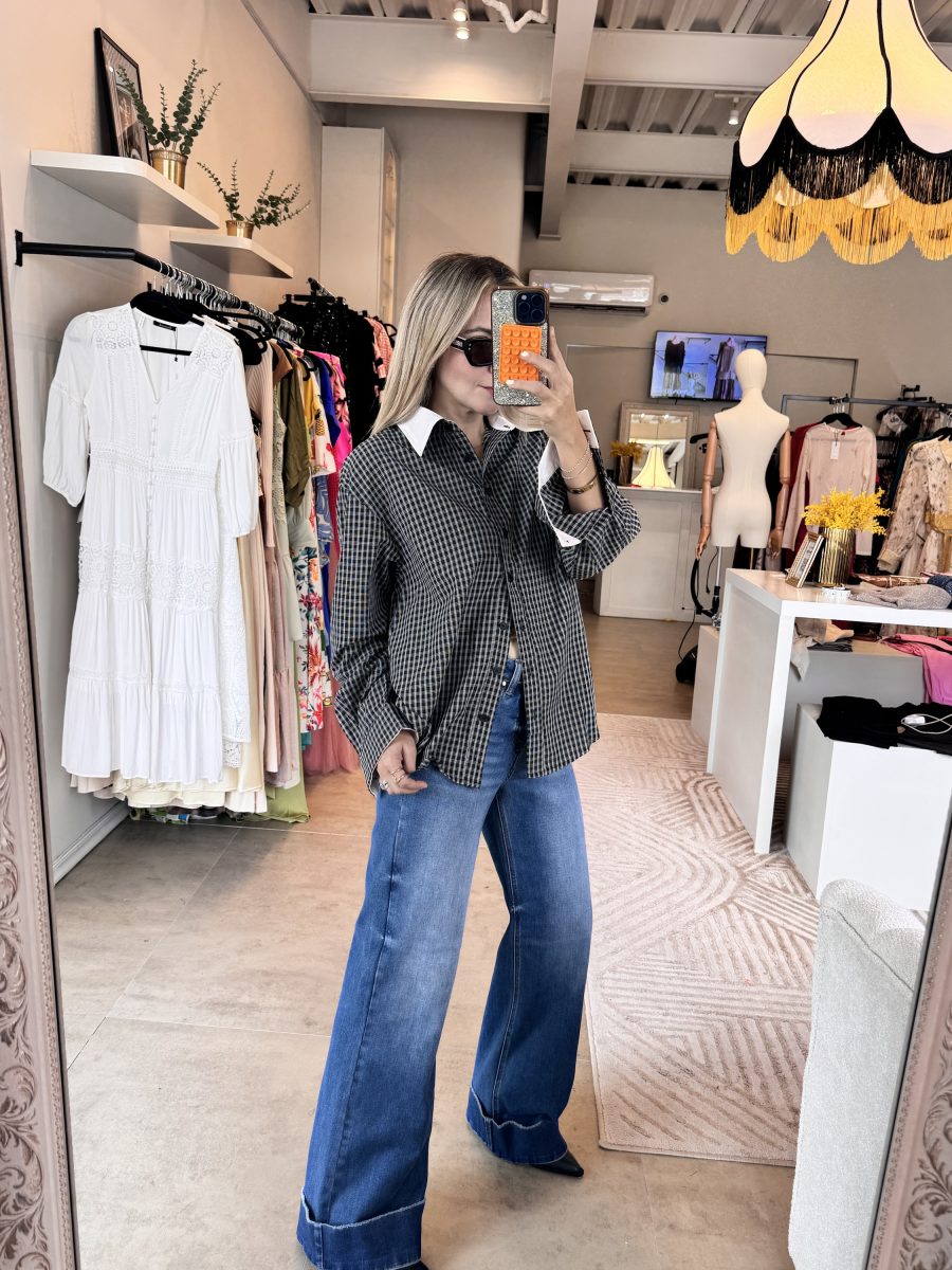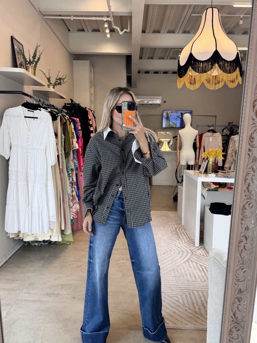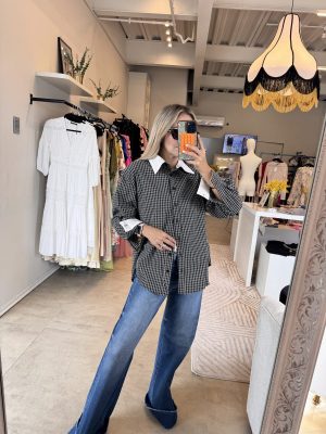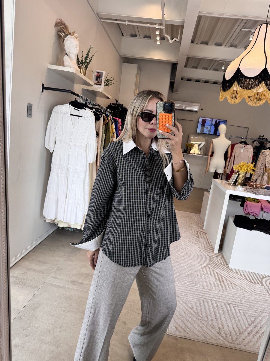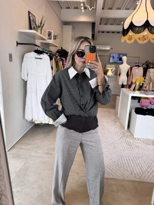 Camisa manga larga abotonada estampado cuadros y cuello blanco