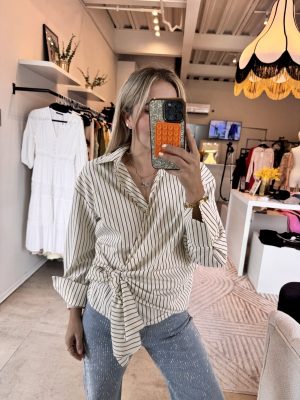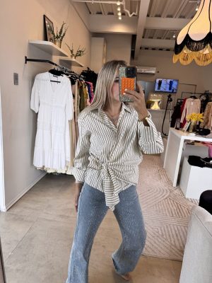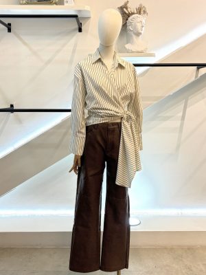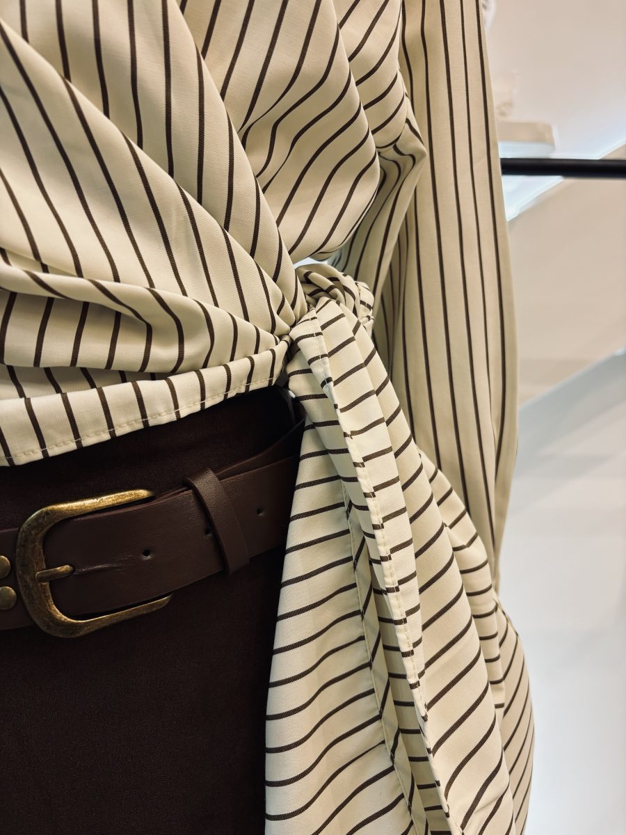Camisa manga larga envolvente color crema rayas cafe tela popelina