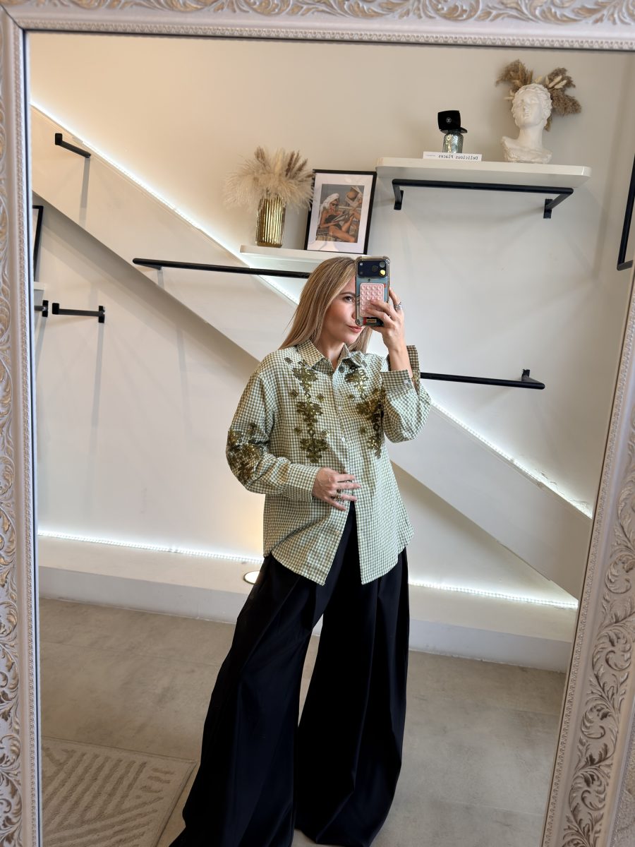 Camisa vichy de botones color verde, con aplicaciones de lentejuela
