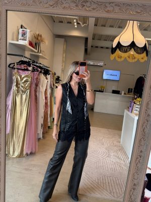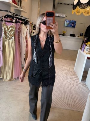 Chaleco largo color negro parte de enfrente vinipiel y la parte de atrás con aplicaciones de flores y lentejuela
