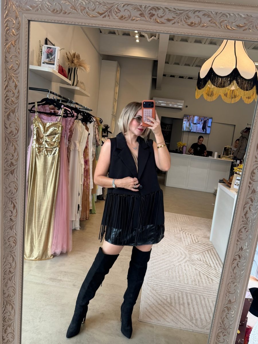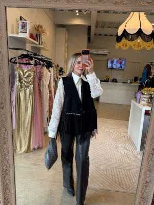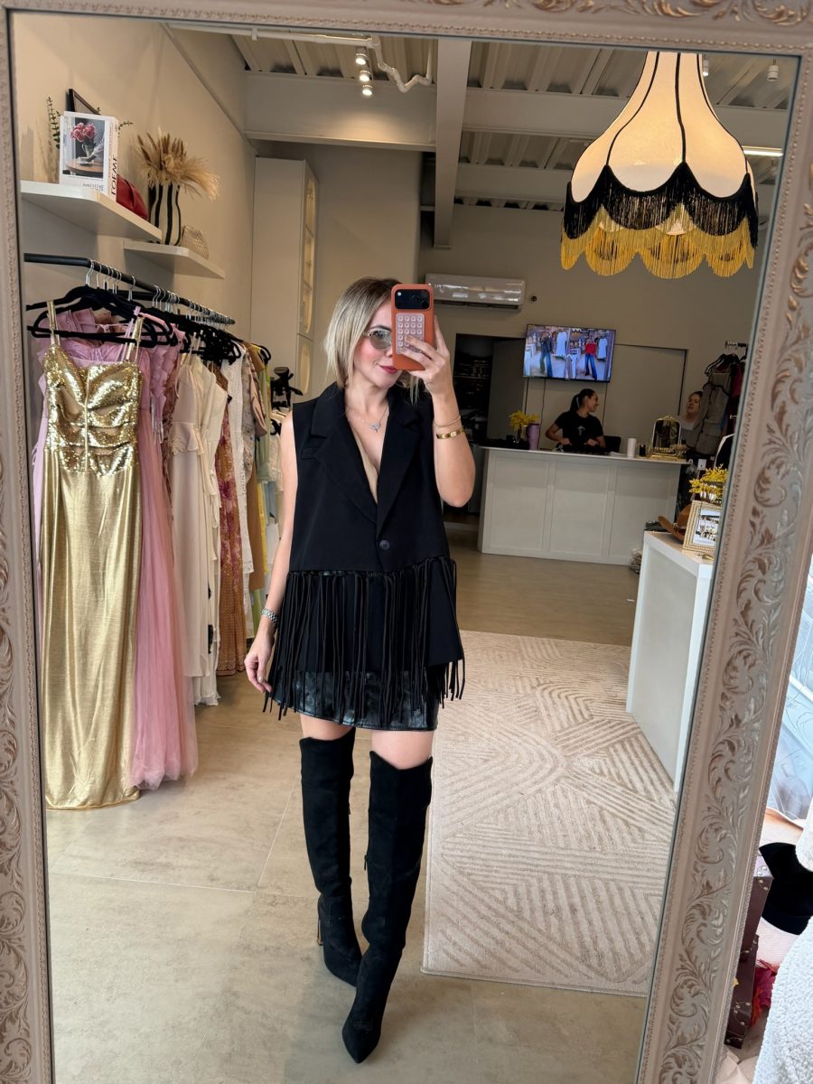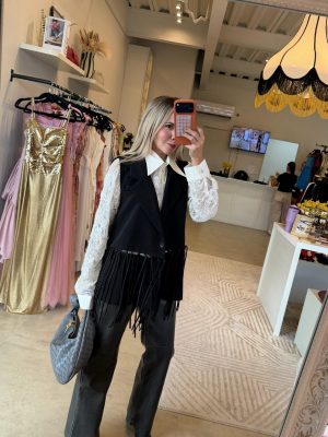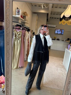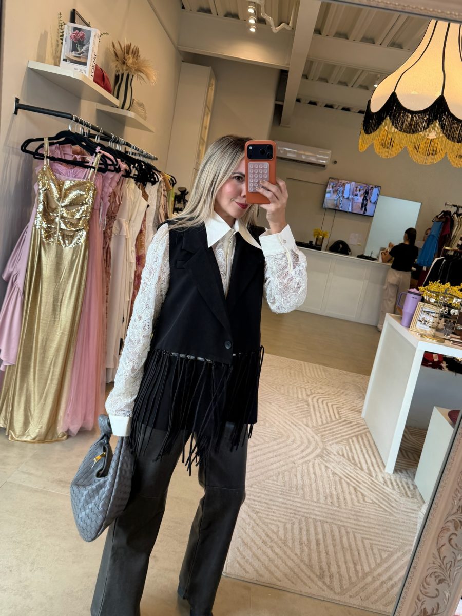 Chaleco color negro con botón en la parte de enfrente y detalle de flecos en la parte inferior