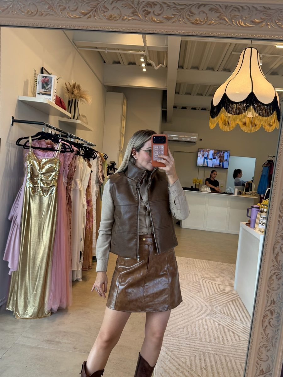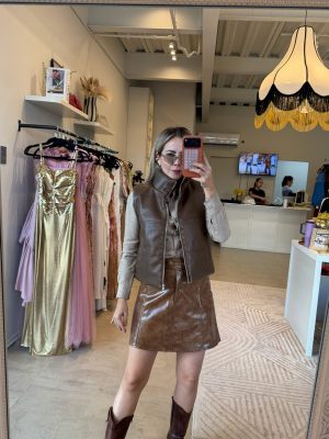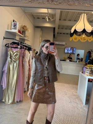 Chaleco cuello alto, color hazelnut con cierre enfrente y bolsas