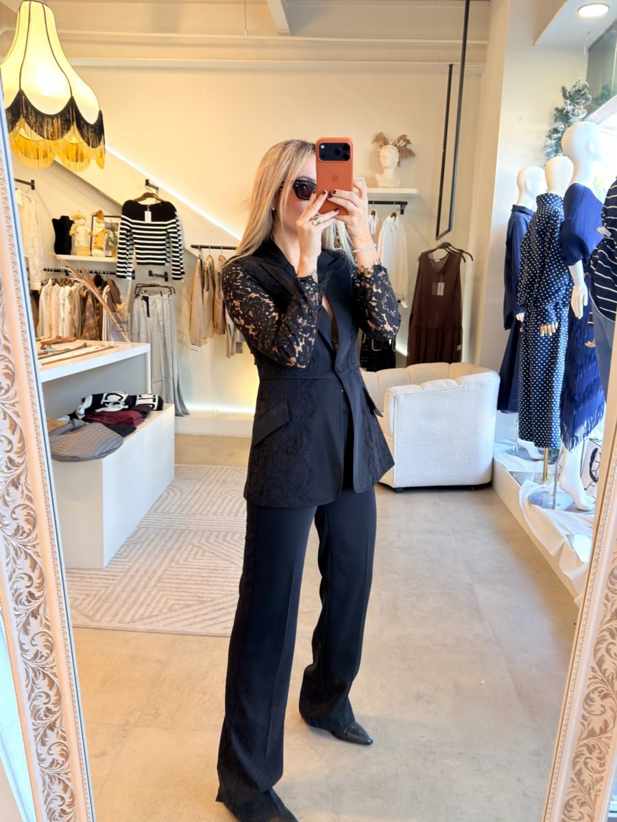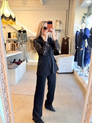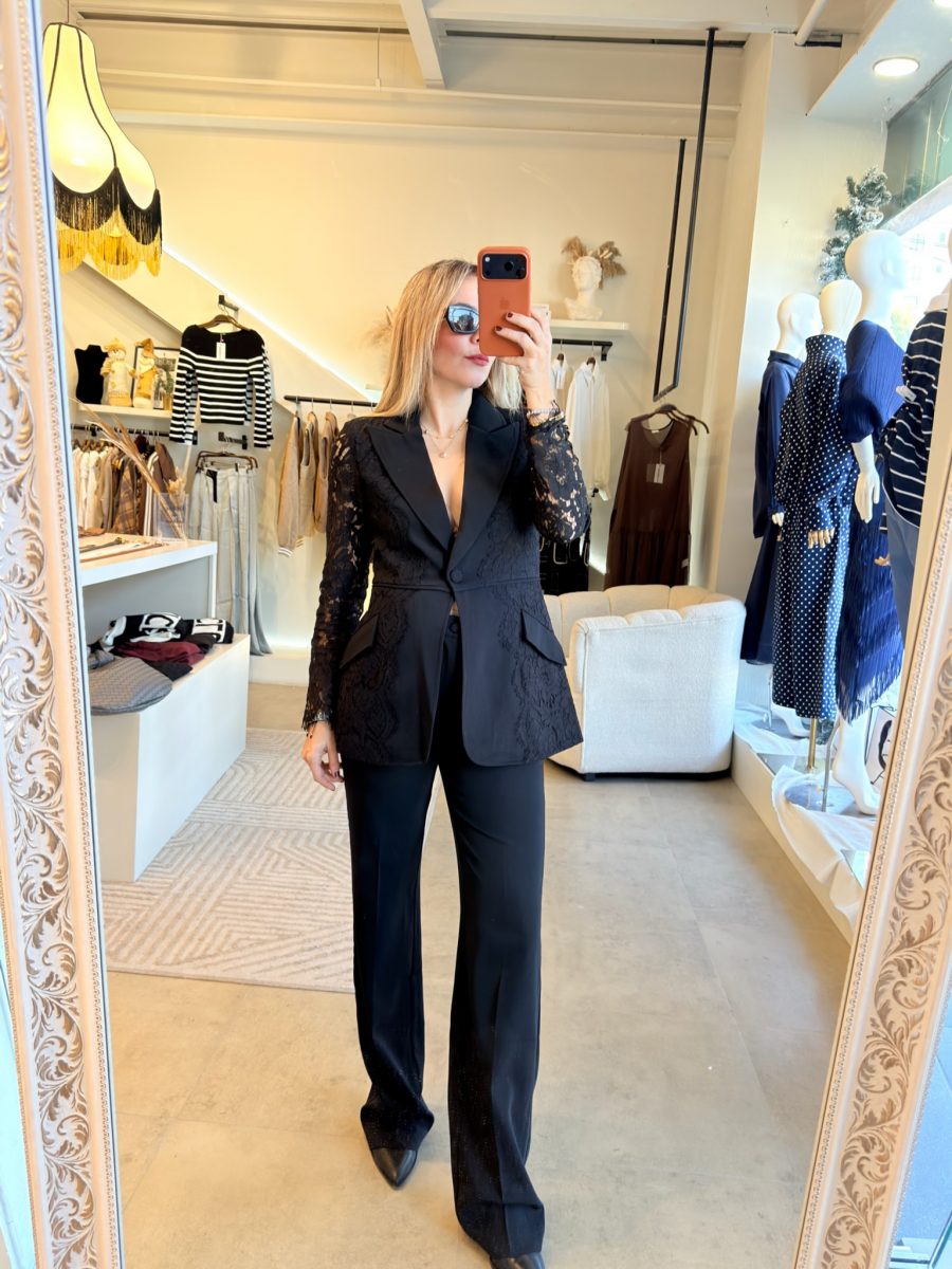 Conjunto black con pantalón y blazer de encaje en mangas