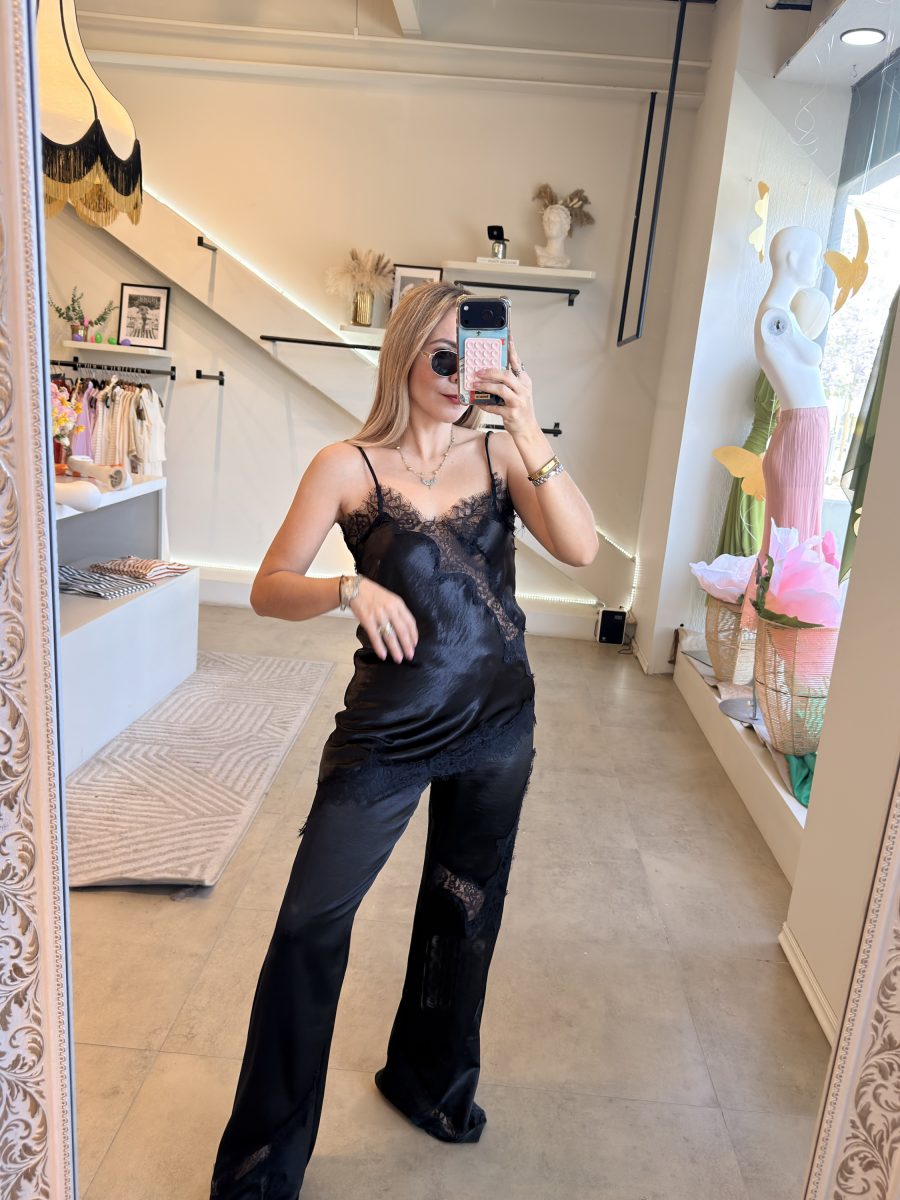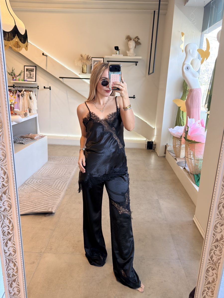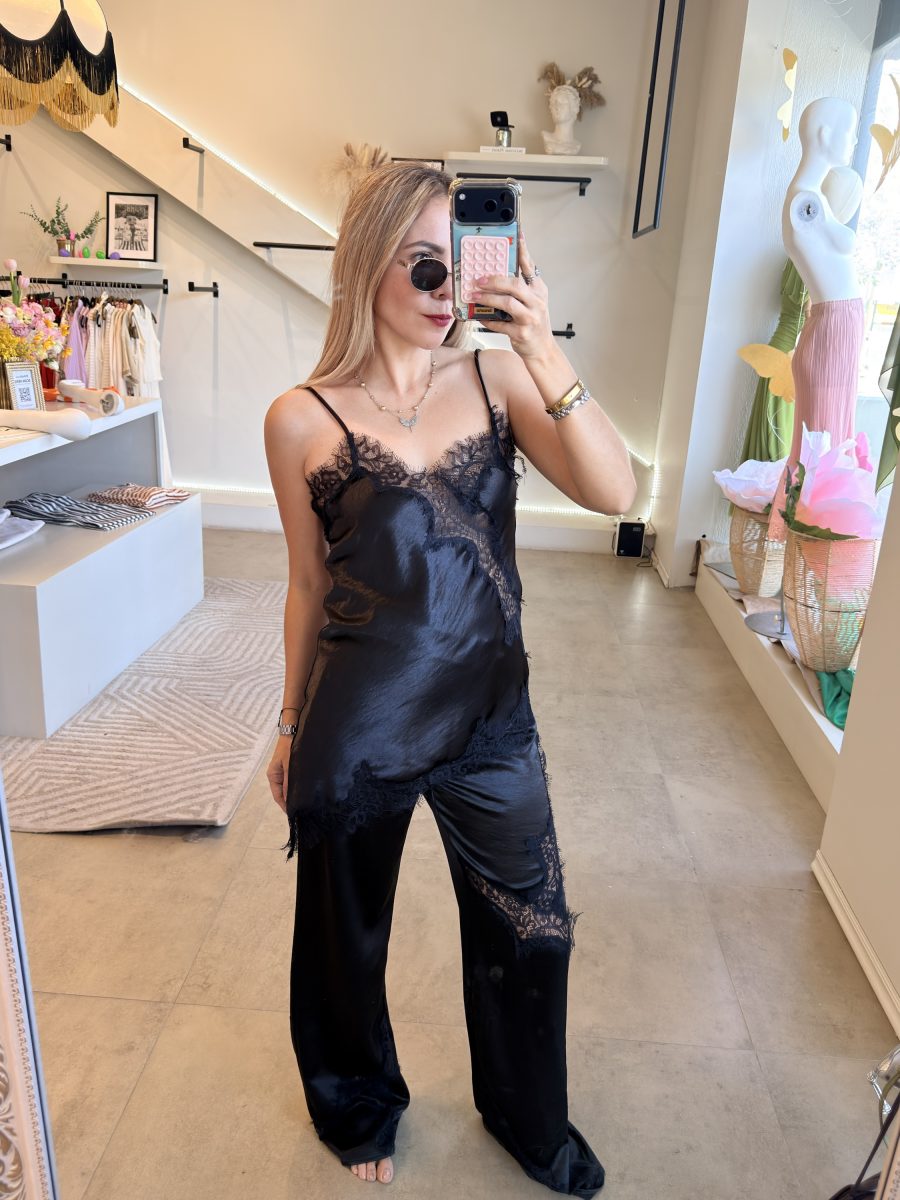 Conjunto satinado de pantalón y blusa con diseño de encaje