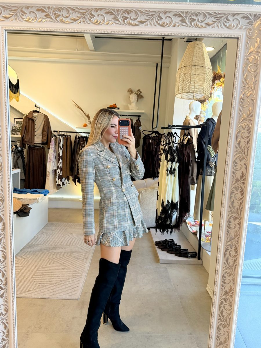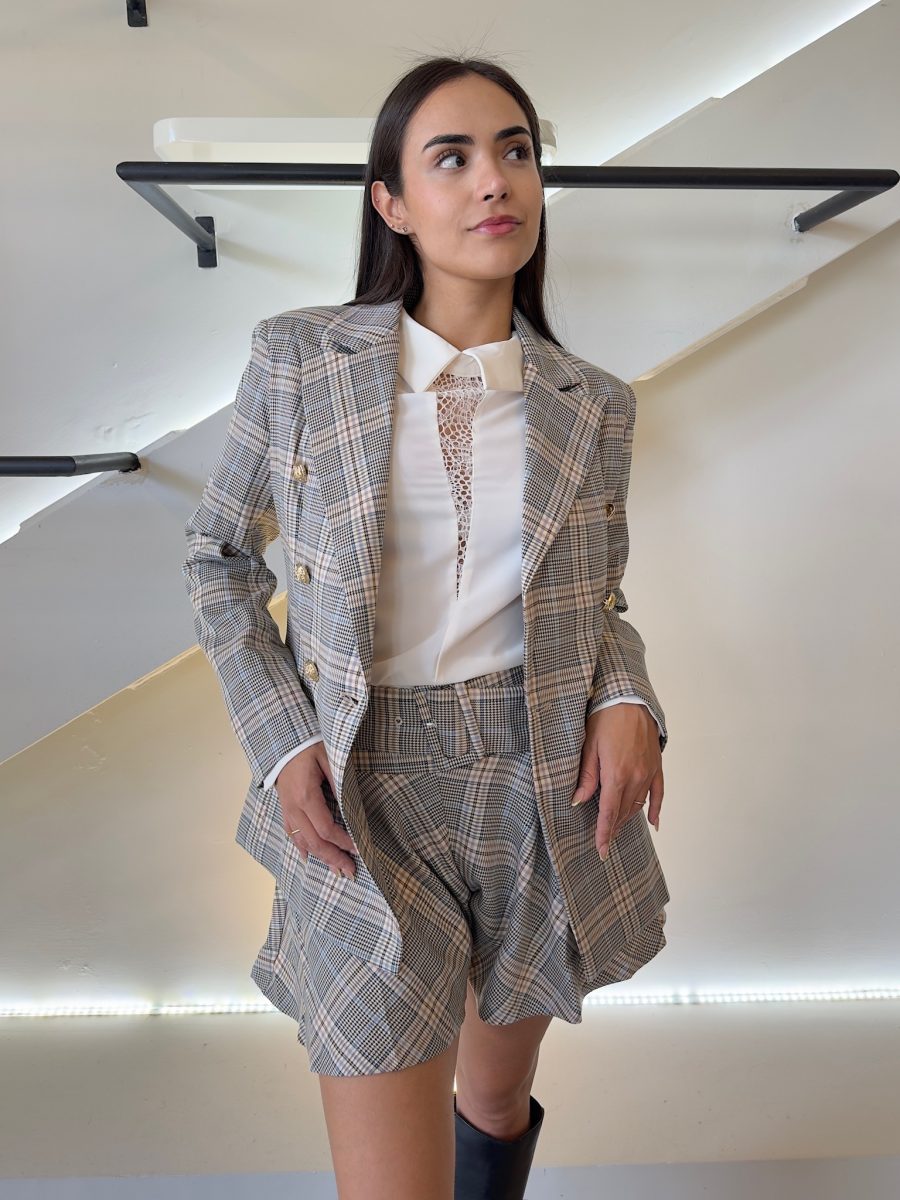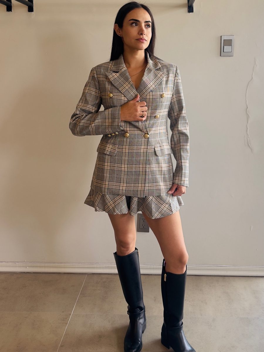 Conjunto Blazer y falda con cinturón estampado de cuadros