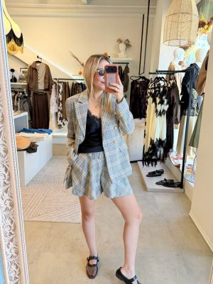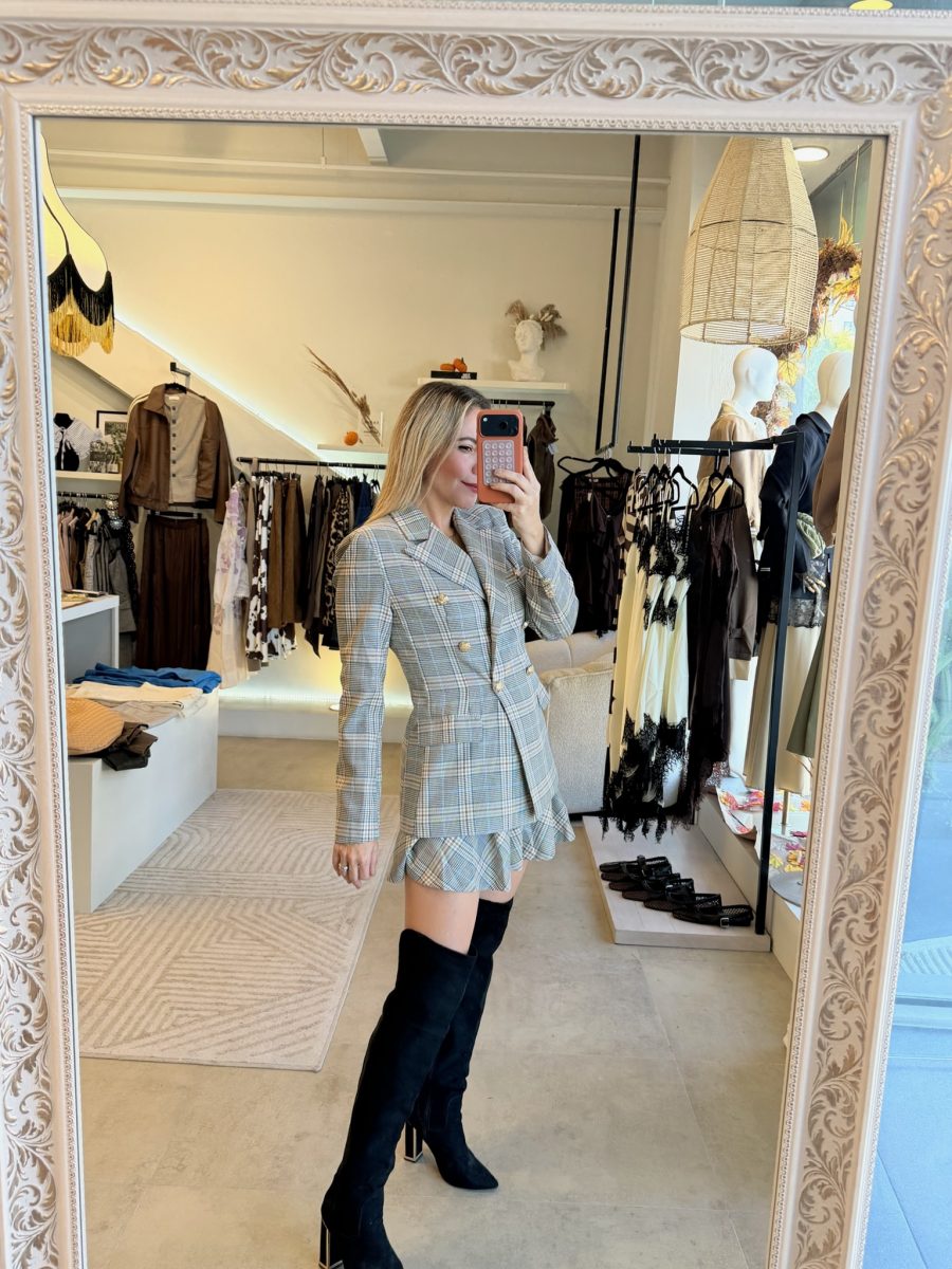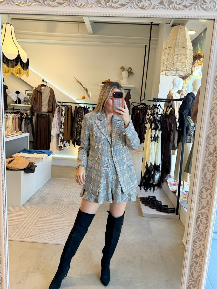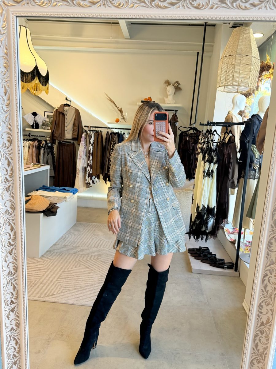Conjunto Blazer y falda con cinturón estampado de cuadros