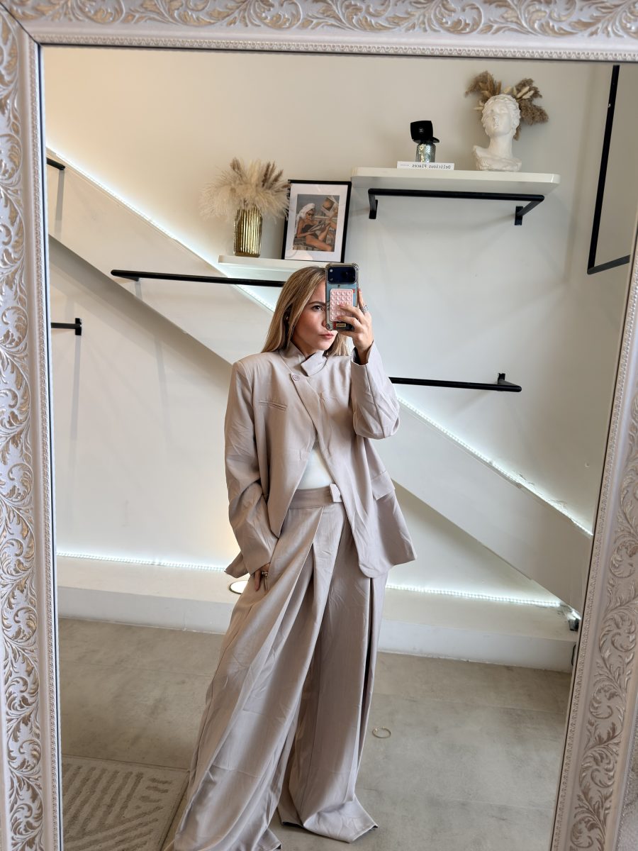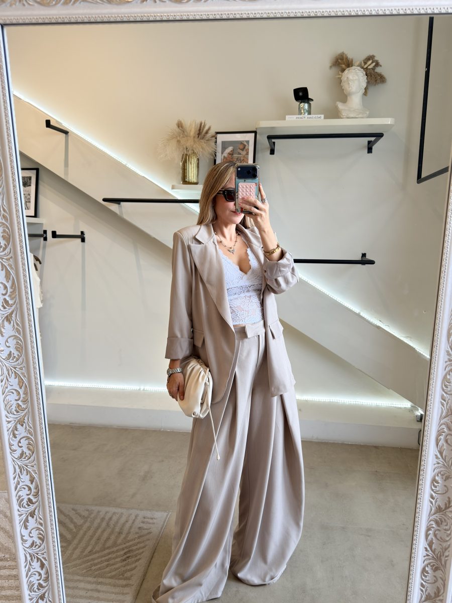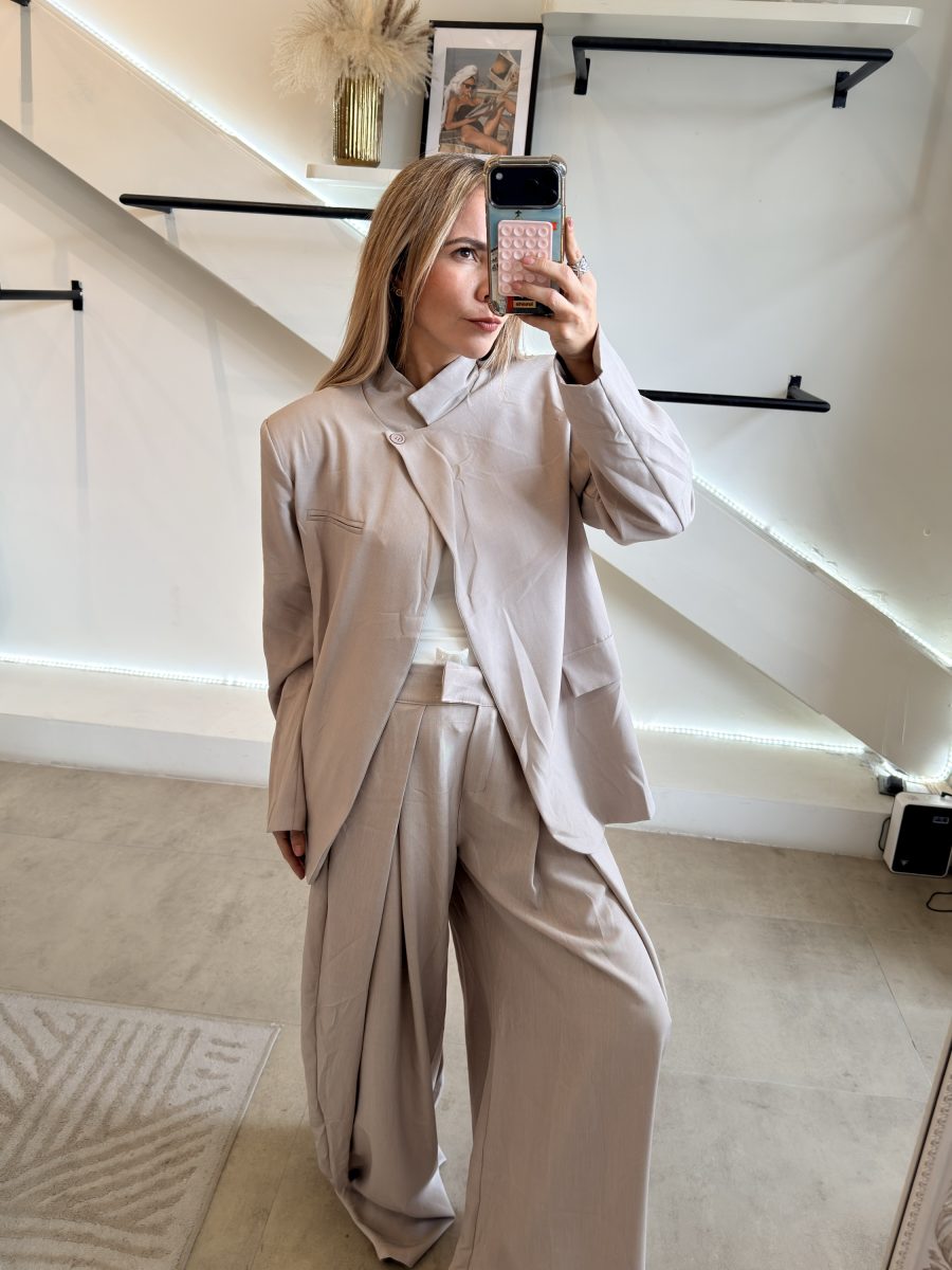 Conjunto khaki de pantalón y blazer tendencia