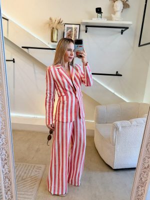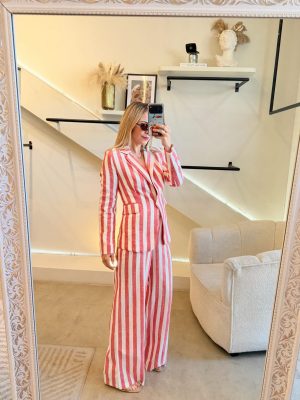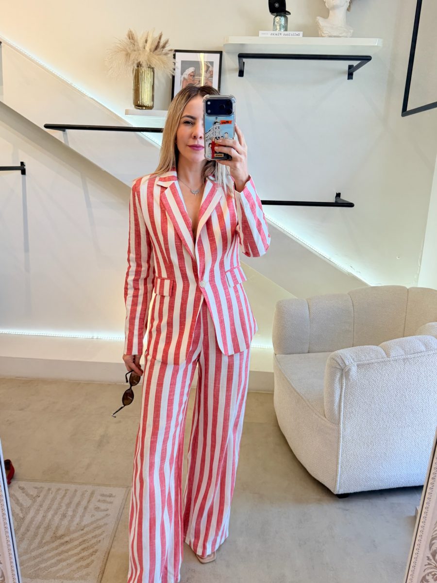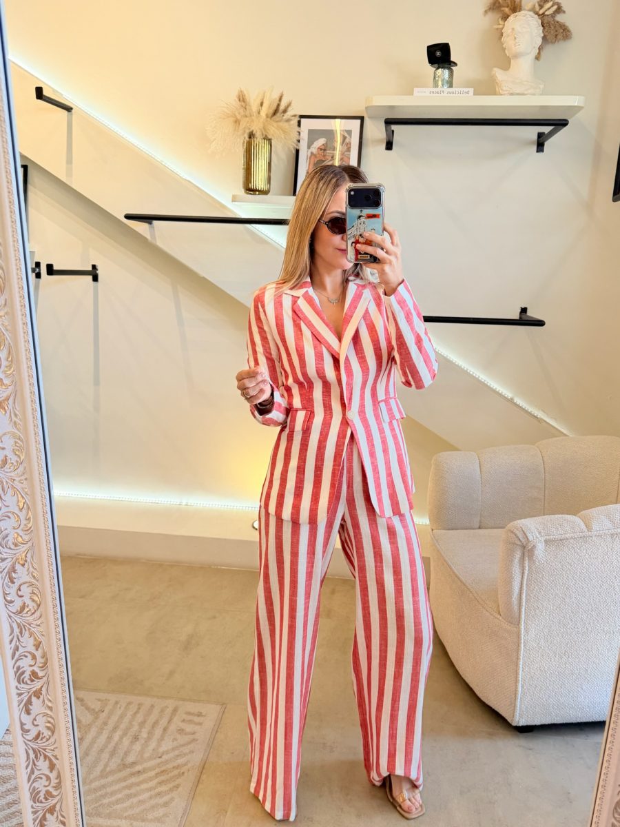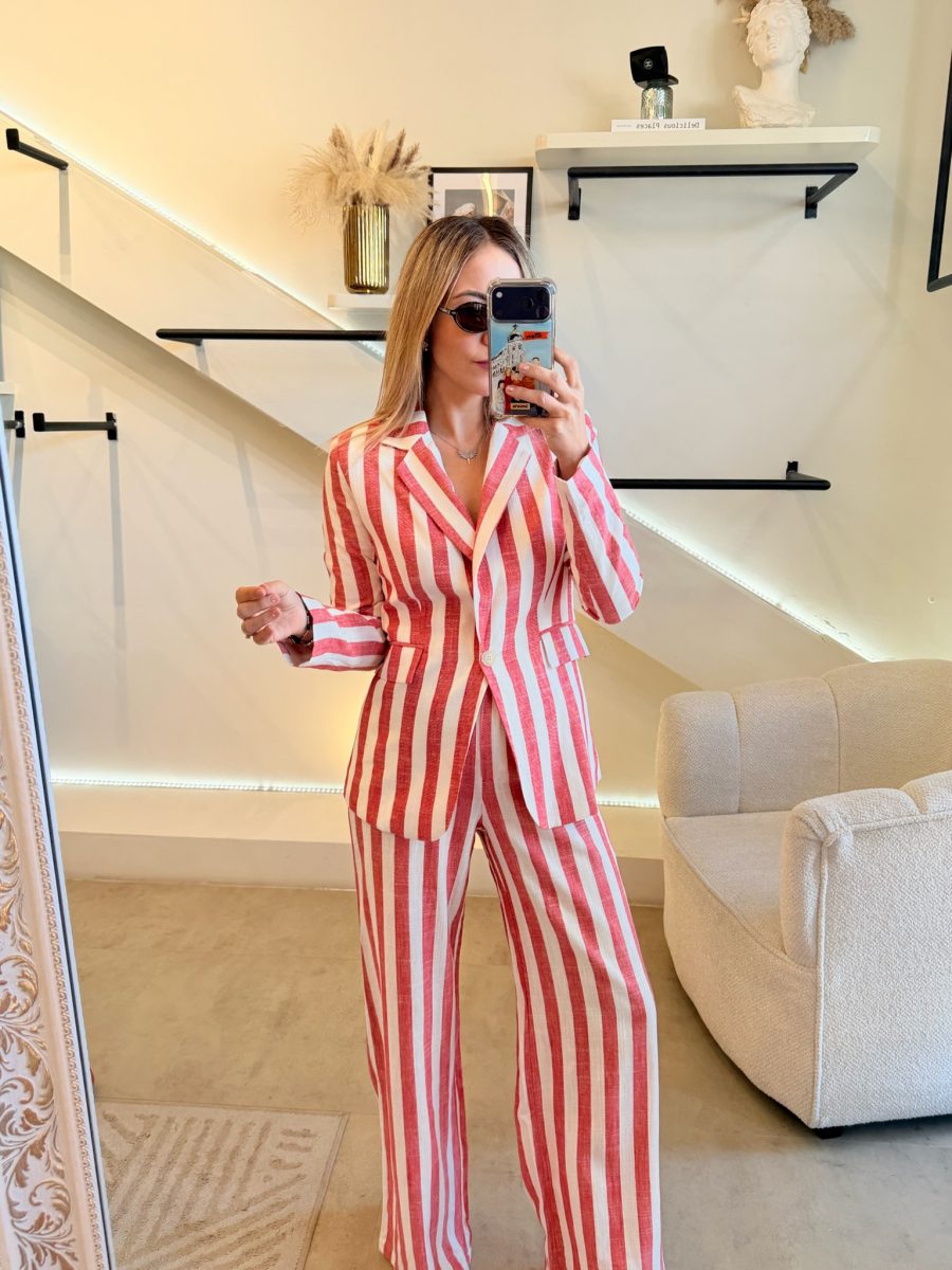 Conjunto blazer y pantalón estampado de rayas color blanco y rojo