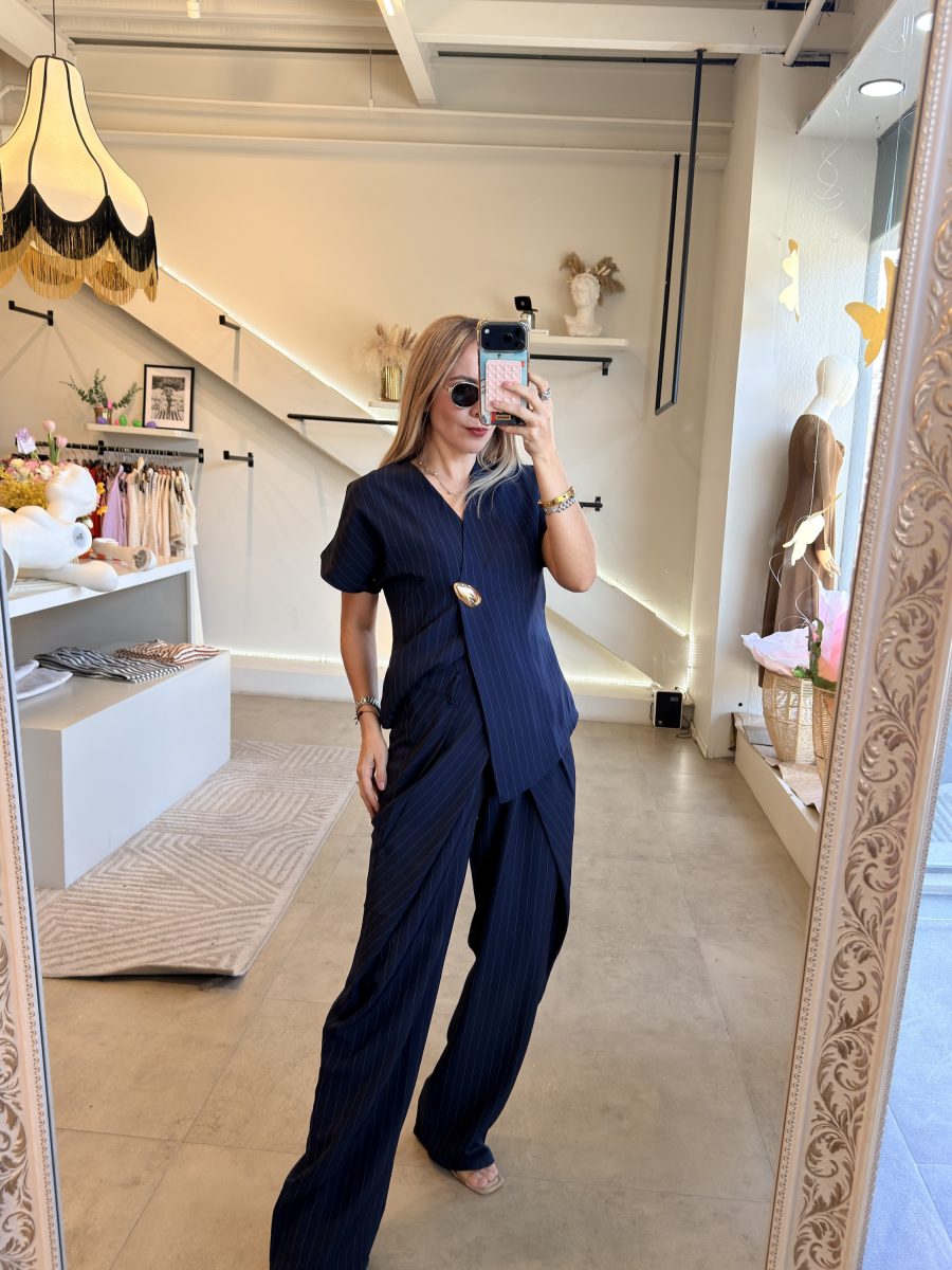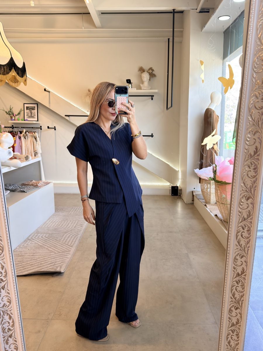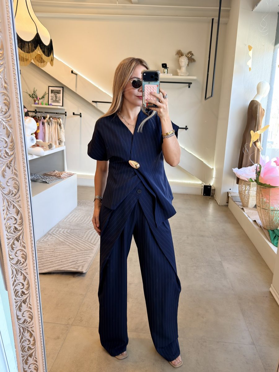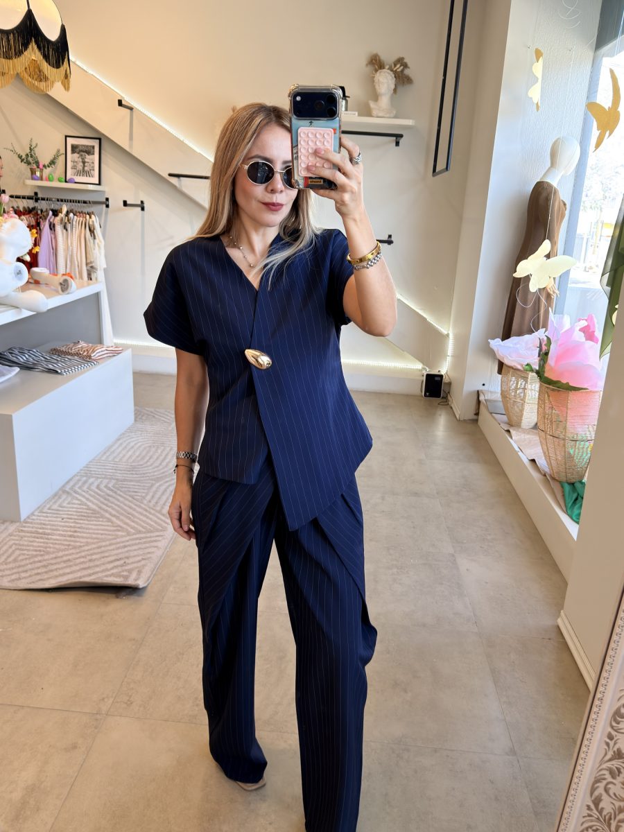 Conjunto de pantalones y chaleco color azul marino con líneas blancas.