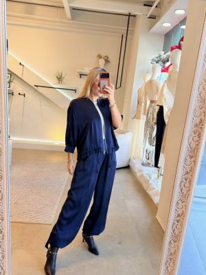 Conjunto bomber jacket manga tres cuartos y listón ajustable en la parte inferior tela satinada color azul