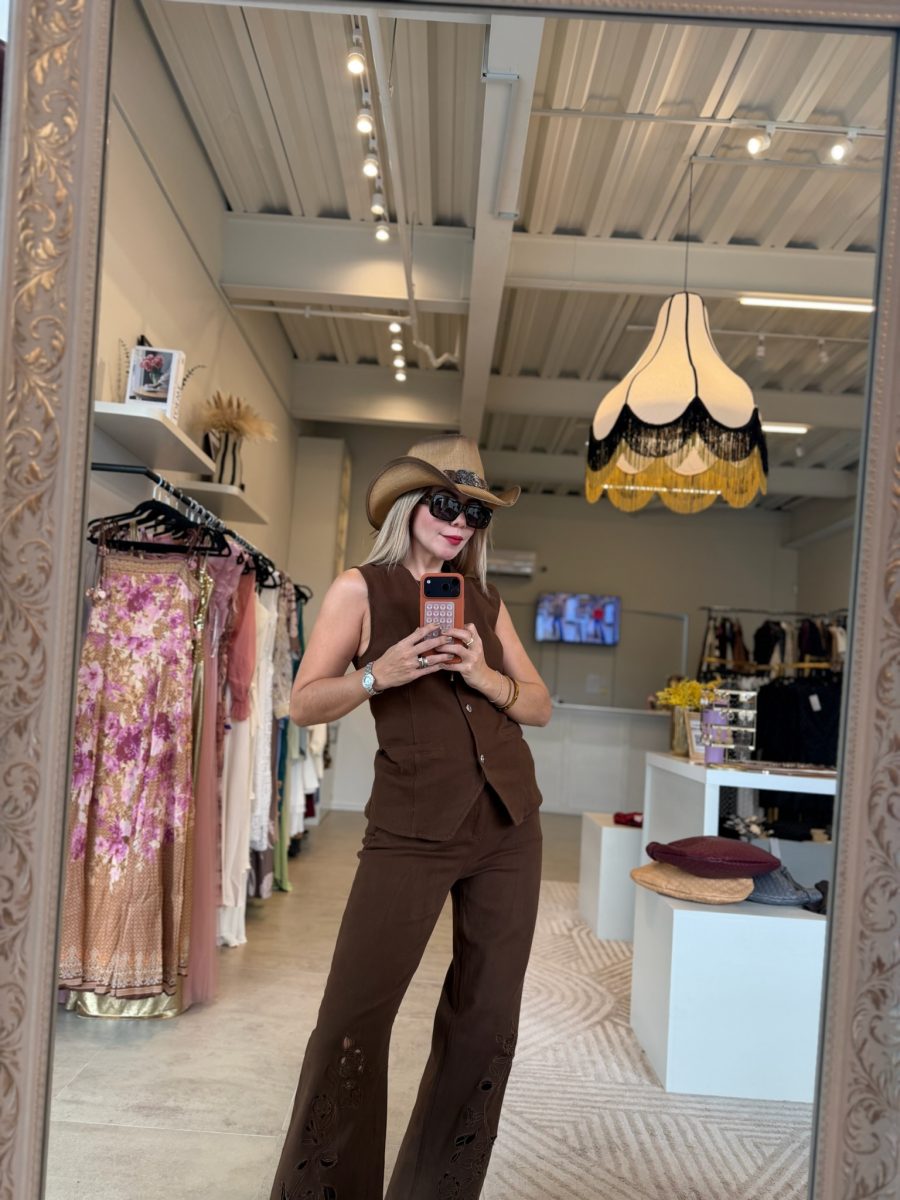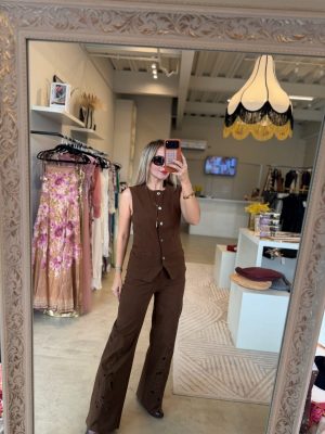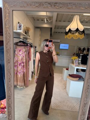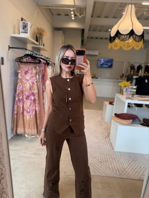 Conjunto con chaleco de botones y pantalón color café mocha aplicaciones de flores en la parte de abajo