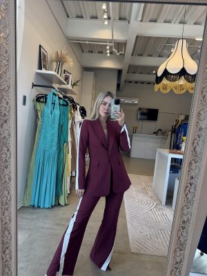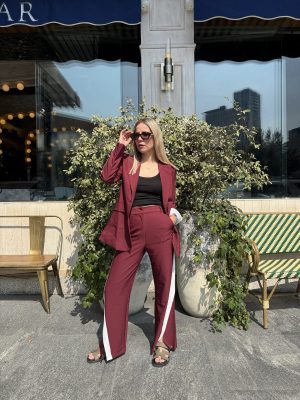 Conjunto pantalón y blazer formal color vino con raya blanca a los lados