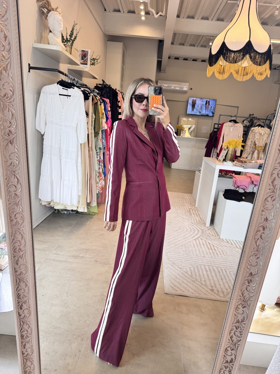 Conjunto blazer y pantalón elástico en cintura color vino con raya blanca