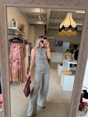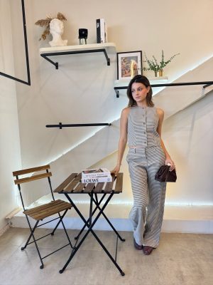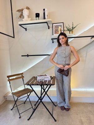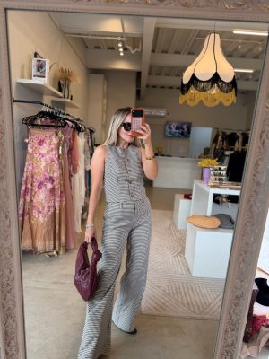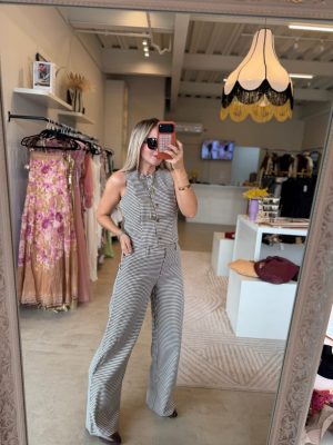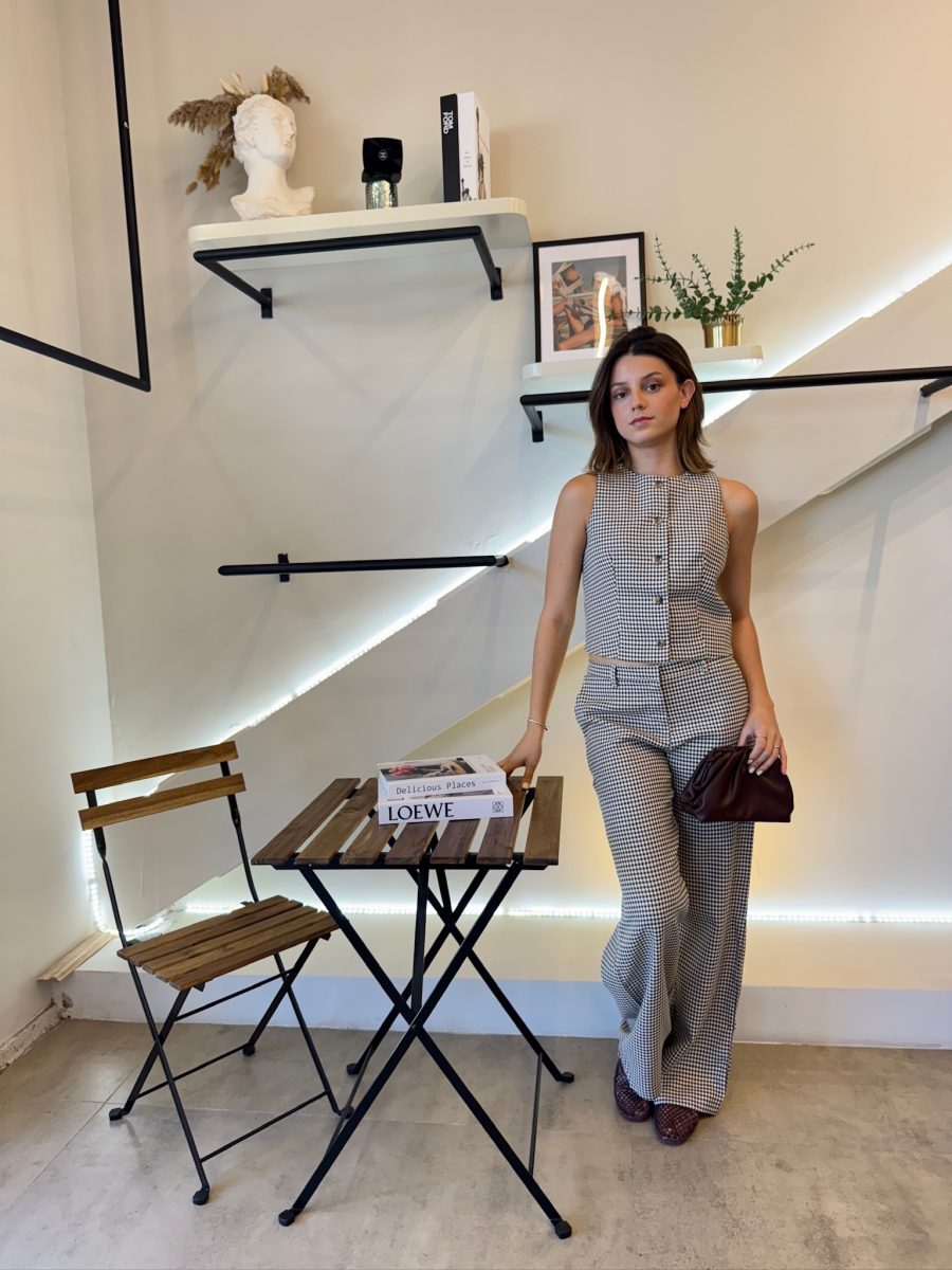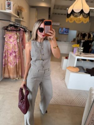 Conjunto de cuadros café con blanco, chaleco con botones y pantalones con resorte en cintura.