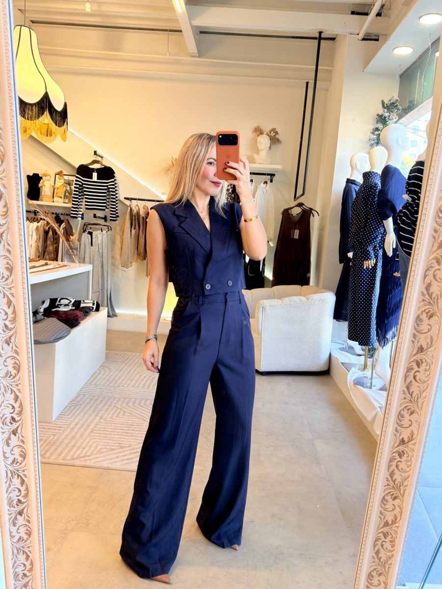 Conjunto azul, con chaleco y pantalones formal sin resorte.