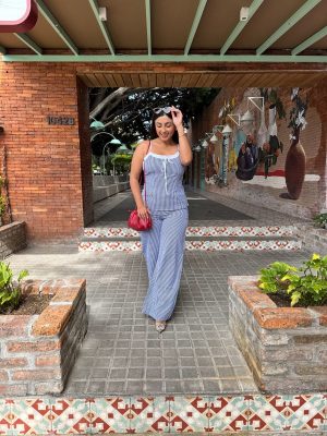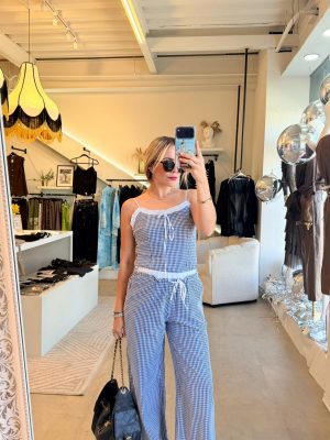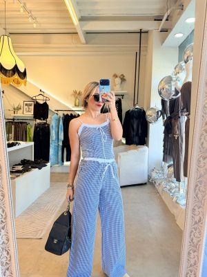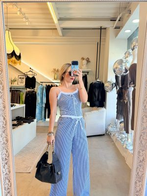 Conjunto blusa tirantes y pantalón resorte con diseño de cuadros azules