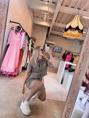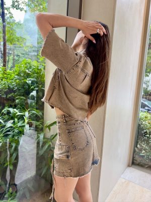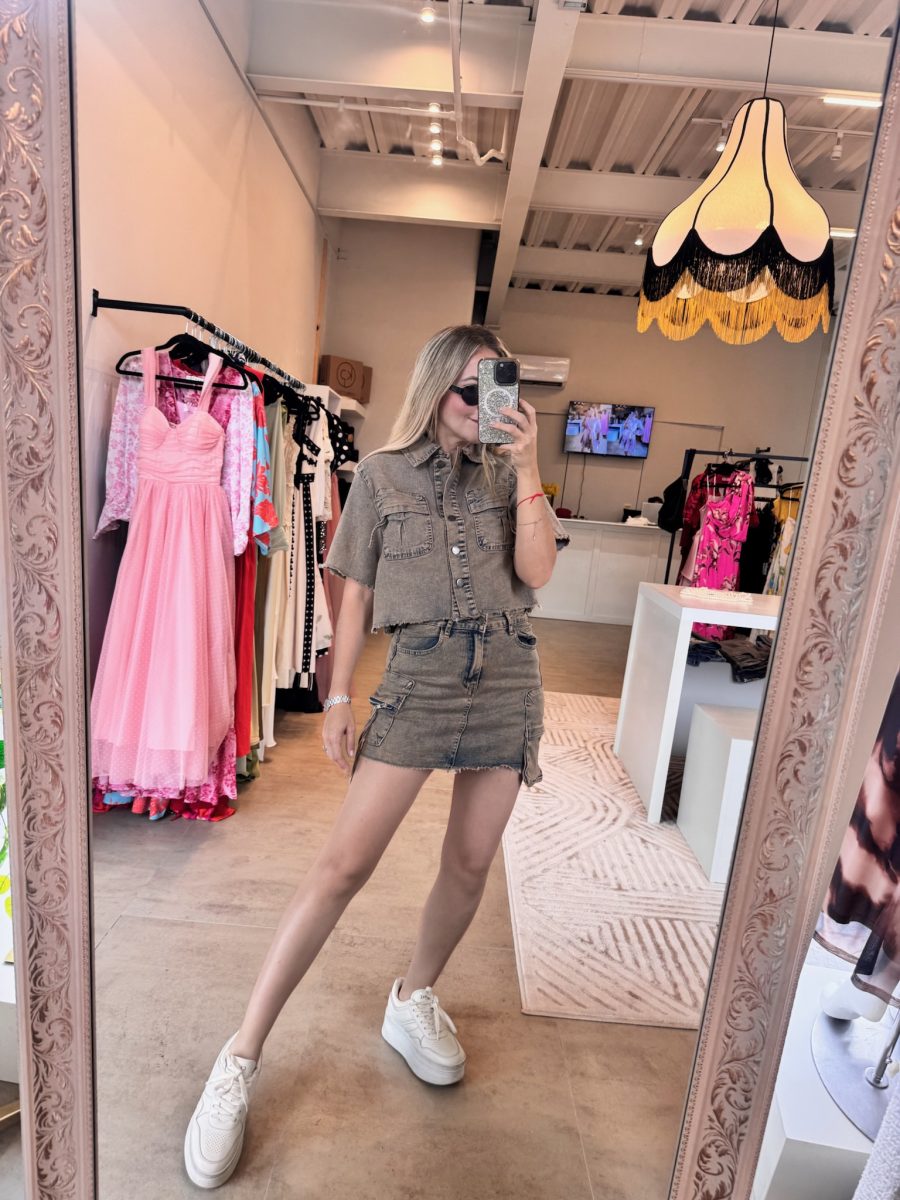 Conjunto blusa manga corta con botones y falda tela de mezclilla delgada stretch color cafe deslavada