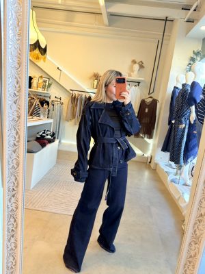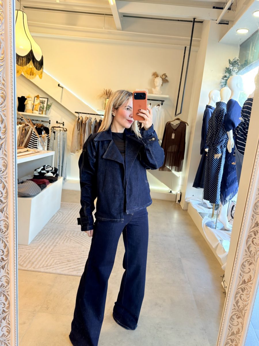 Conjunto de mezclilla con pantalón y cazadora ( incluye listones de mezclilla para cazadora)