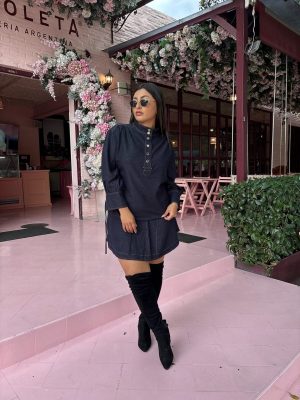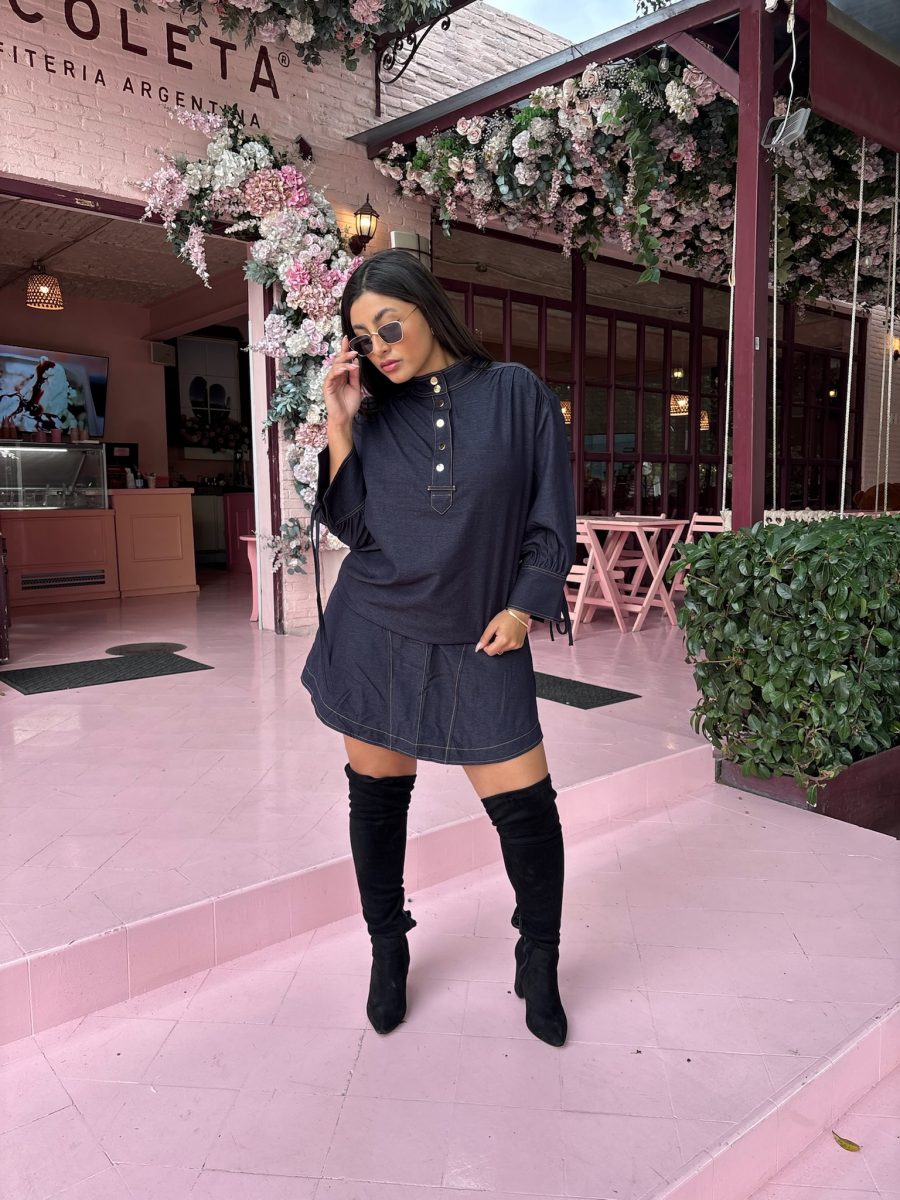 Conjunto blusa manga larga y falda color azul oscuro tela de algodón stretch