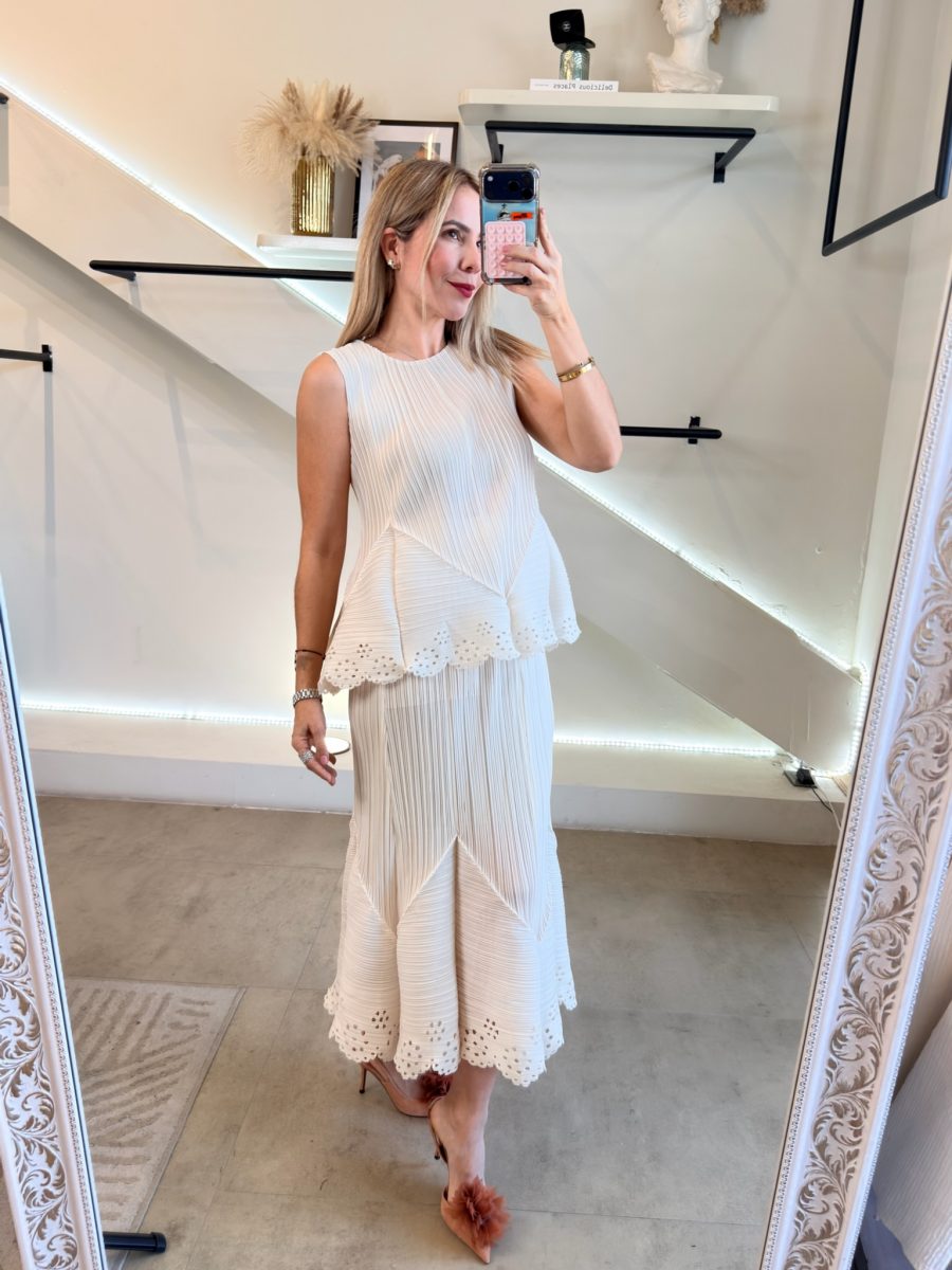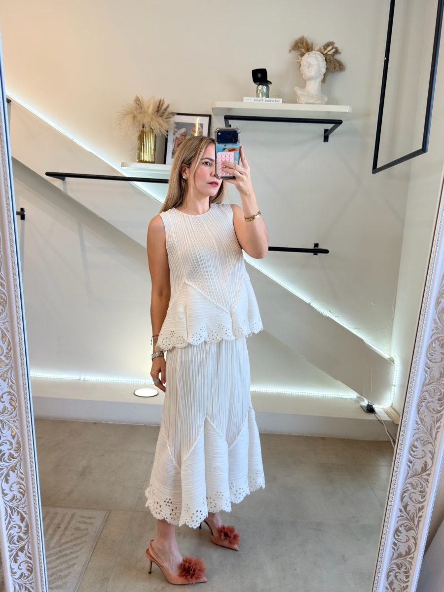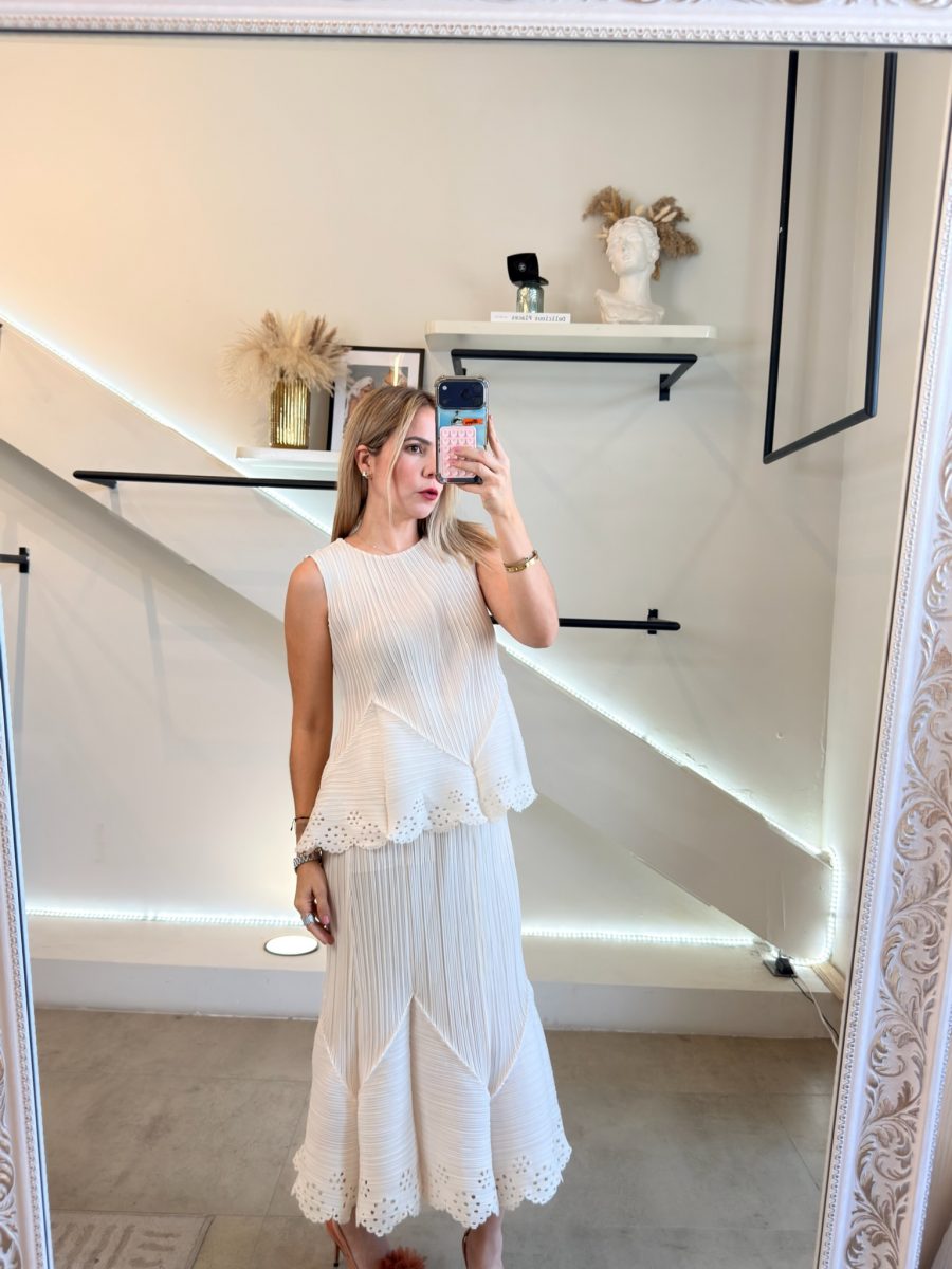 Conjunto falda midi con diseño plisado y diseño primavera green en blusa y falda