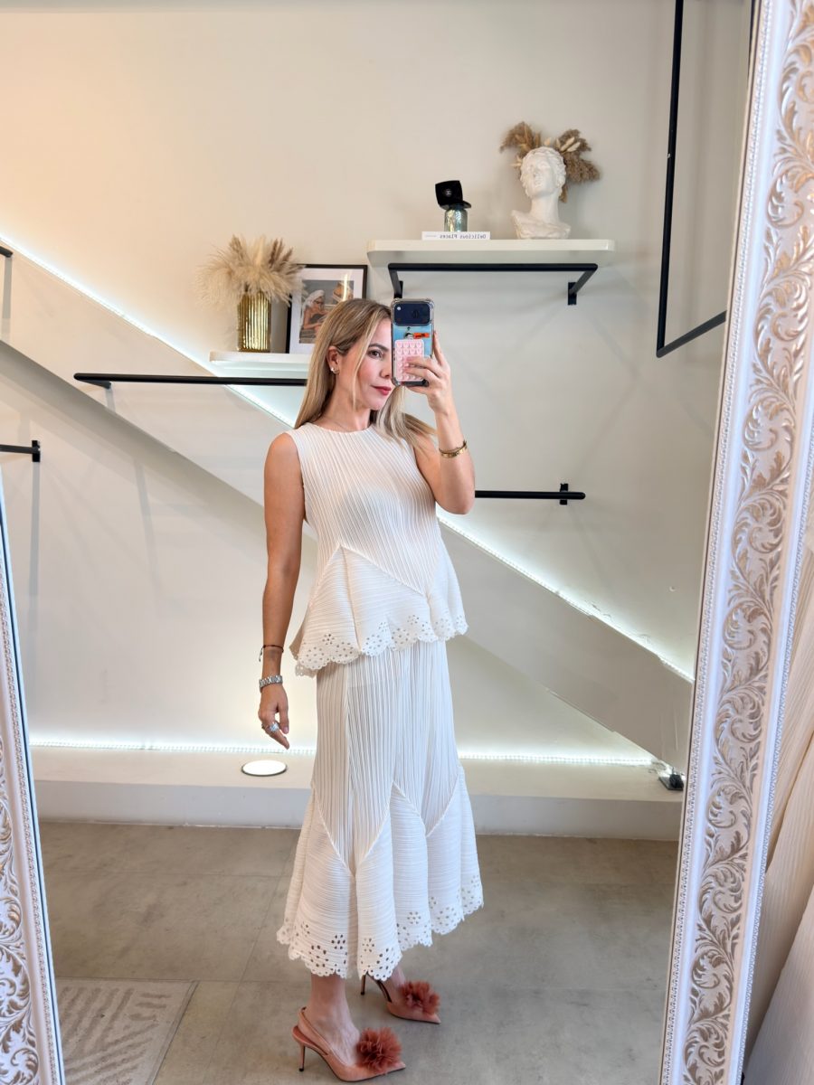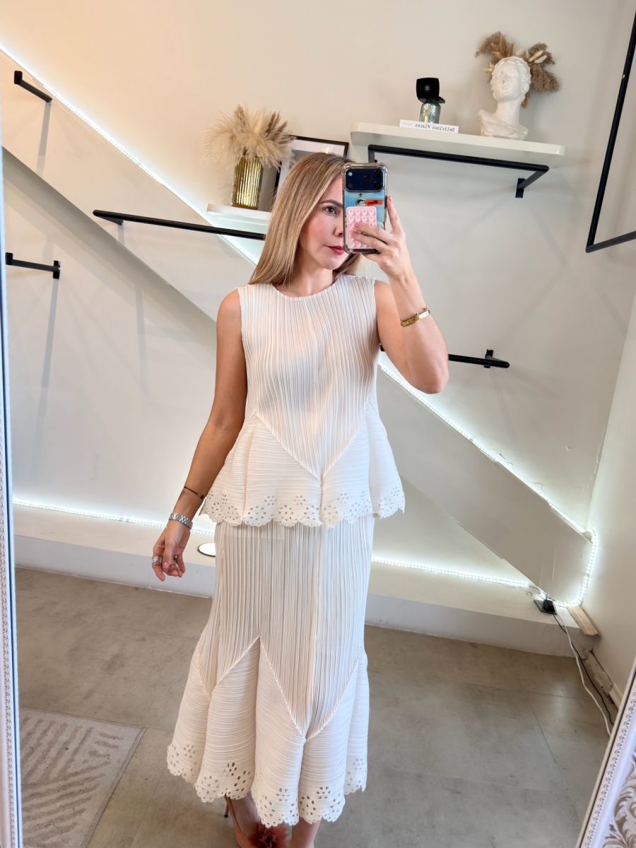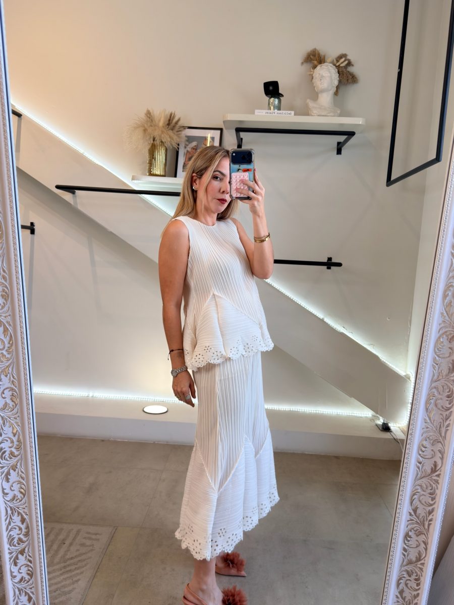 Conjunto falda midi con diseño plisado y diseño primavera green en blusa y falda