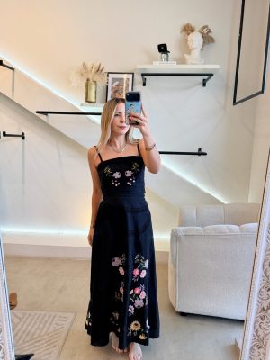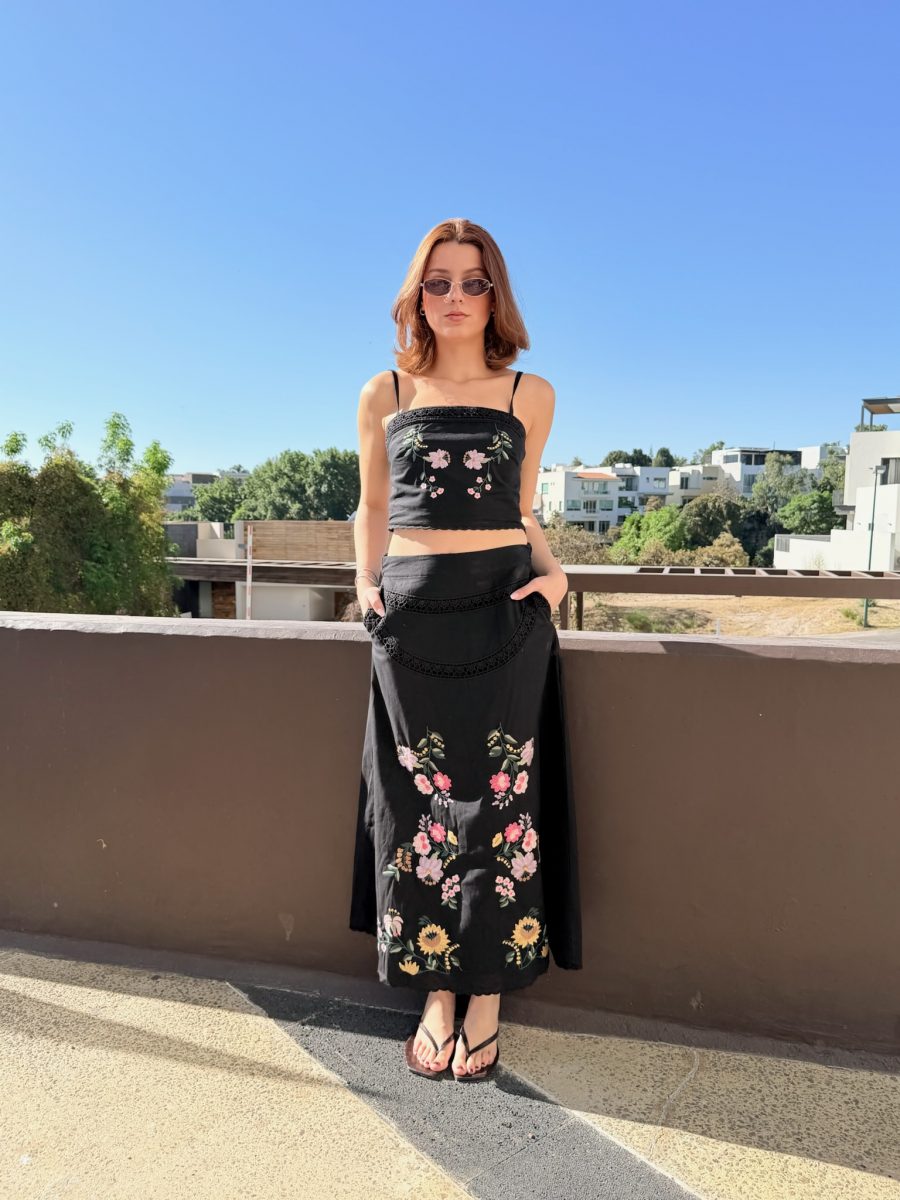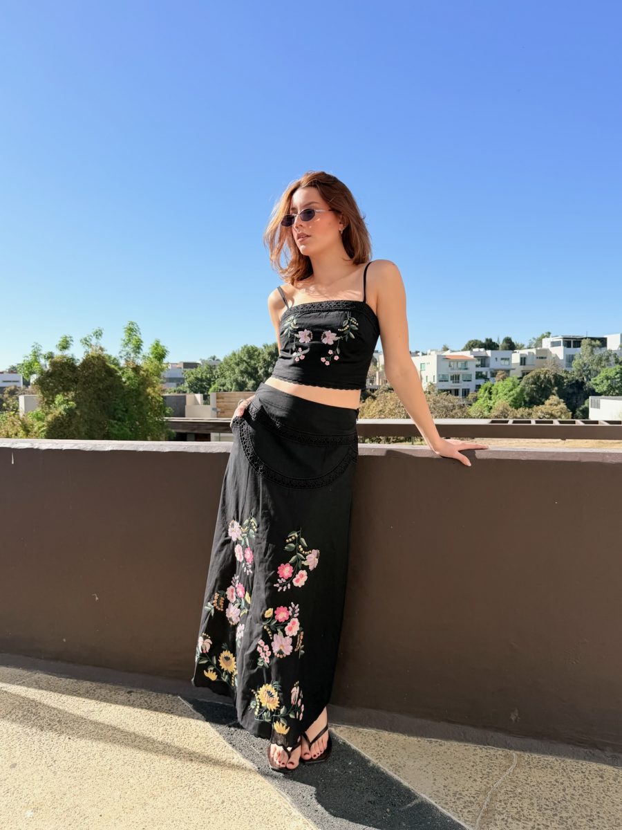 Conjunto falda larga y blusa tirante color negro con bordado de flores de colores