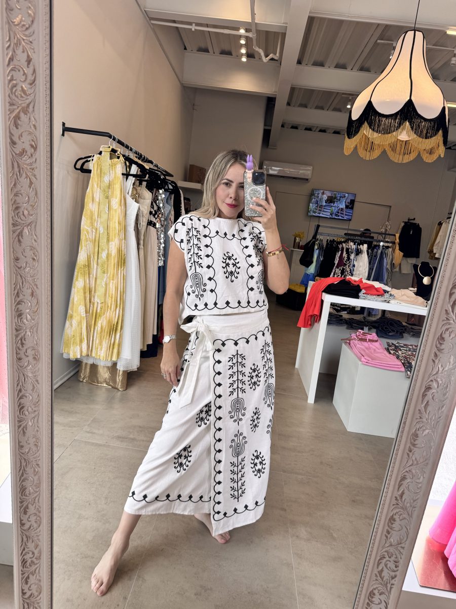 Conjunto blusa con botones en espalda y falda envolvente color blanco con bordados en color negro